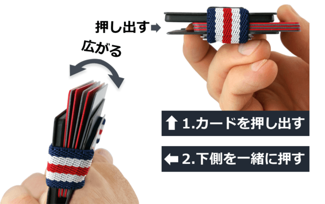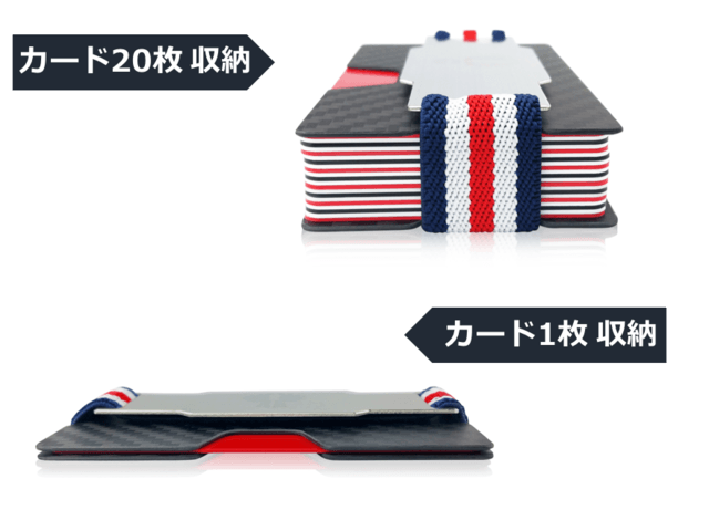 収納力の秘密は高性能伸縮バンドにあります。カード1枚から20枚まで、柔軟に収納できるので、カード枚数によってウォレットを変える必要はありません。