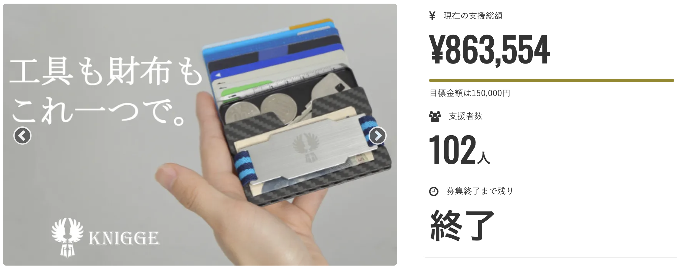 2020/03/31 06:58支援者のみなさまお世話になっております。本日、プロジェクトが終了し、102名の方々にご支援いただきました!スタッフ一同皆様に心より感謝申し上げます。メーカーに生産手配をし、みなさまのお手元に確実に商品をお届けできるよう、全力を尽くします。進捗状況は活動報告にて、定期的にお知らせいたします。引き続きよろしくお願いいたします。KNIGGEジャパン もっと見る