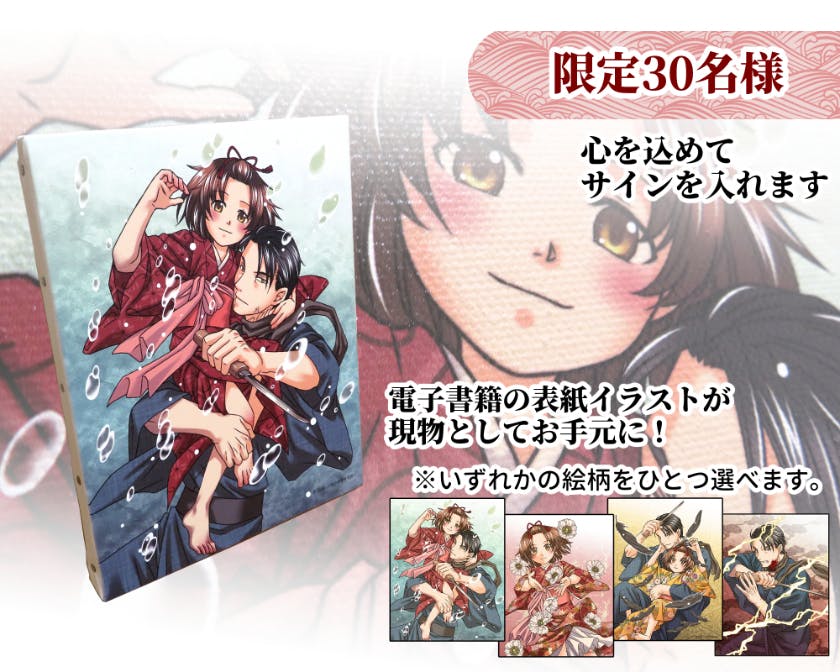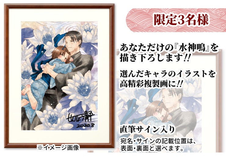 お好きなキャラを二名選んで頂き、描き下ろしイラストにします。それを高精彩複製画にして額装付きでお届け!直筆サイン入り。限定3名様!