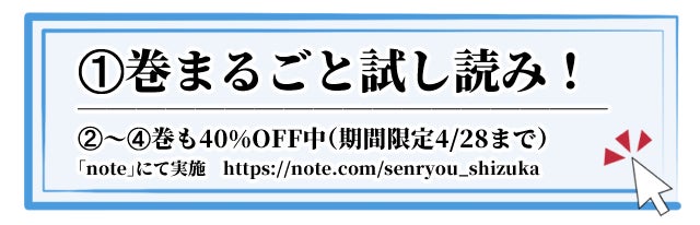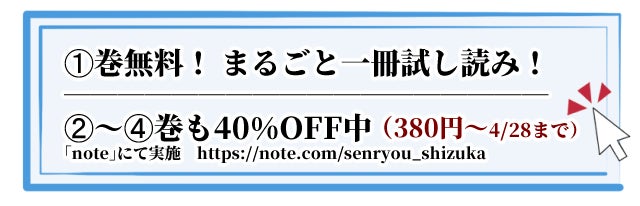 2020/09/26 20:17暑い日も少なくなり、秋らしくなってまいりました。ころころと変化する気温で体調など崩されていないでしょうか?さて、クラファンの目的の一つとして下記を挙げていましたが、ついに、描き下ろしの第五章、1話目を公開いたしました!https://note.com/senryou_shizuka/n/n4845ea11b19a続きは→https://note.com/senryou_shizuka/n/n4845ea11b19anote(有料)にて更新していきます。新作の第五章は電子書籍6巻から収録されます。電子書籍でお読みの方は6巻配信まで少々お待ち頂けると幸いです!なにぶん個人でやっていますし手探りなところもありますので、商業ほどのスピードで続きを出すことは難しいですが、粛々を進めて参ります!よろしくお願い致します!―――――――――――――――――――――――5巻は先日、各ストアにて配信スタートしております!まだの方は、ぜひ普段お使いのストアにてお求めくださいませ。<Kindle>https://www.amazon.co.jp/dp/B085DNC9VT/ref=cm_sw_em_r_mt_dp_rehwFbQQVNJ55<シーモア>https://www.cmoa.jp/title/195871/vol/5/他多数のストアで配信中! もっと見る