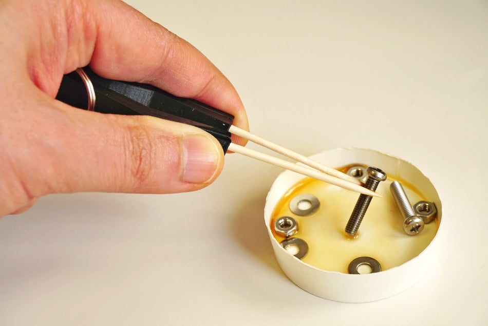 作業などで、どうしても滑るものなど掴みにくいものをより掴みやすくするには、こういった強化方法もあります。こんな風にダブルモードで先端の又にちょっと引っかけて、ゴムをクルクル回してまた先端に引っかけ止めれば輪ゴムが滑り止めになりますよ。(くっつかない様にパウダーがかかっている輪ゴムもありますが、一度水で洗うとグリップが増すのでお試し下さい)アイディア次第で案外いろんな用途に使えるのですが、色々と試すと小さな木片である爪楊枝もなかなか奥の深い素材です。設計上普通のピンセットよりも左右の間隔が広くしているため、ゴムを巻いてもまだまだ色々なものが挟めますよ。使い方の可能性を追求してみてくださいね。