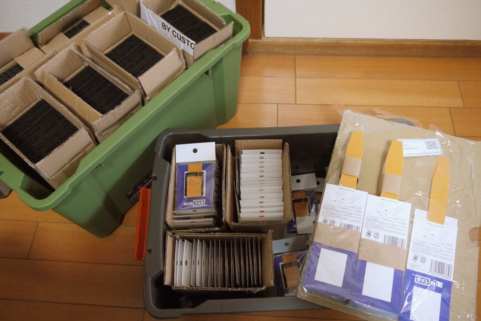 ご支援者の皆様はじめまして。セカンドロックの植田です。皆様のMIMITABへのご支援とご理解、大変有難く嬉しいかぎりです。ふと思ったのですが、まだ世に出ていないものをクラウドファンディングで支援するとなると、何か見えない部分が多い気がして不安な気持ちになられるのではないでしょうか。少しでも安心していただけたらと思いパッケージ前の画像をアップします。左上に写っているのが本体達。これが4箱ほどあって全部で約4000組ほどあります。右下に写っているのがCAMPカラーの台紙達。そして真ん中にパッケージ済みとなった出荷待ちのMIMITAB達。募集期間終了後には速やかに発送できるように、少しづつパッケージしていってるところですので、ご安心ください。
