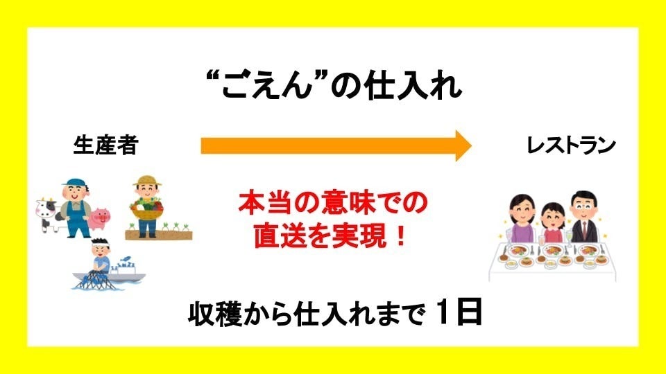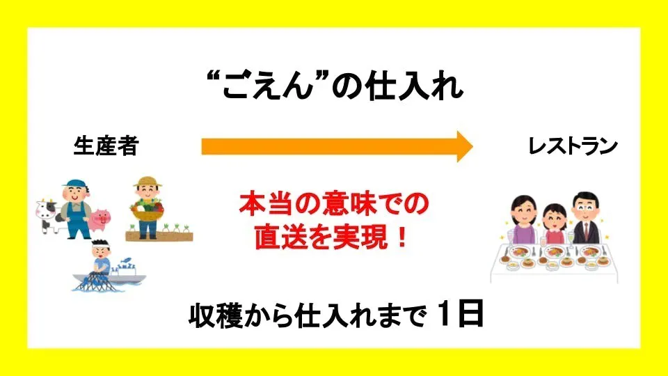 一方“ごえん”では、直契約を結ぶことで収穫からわずか1日で仕入れをすることが可能となり、より新鮮な食材をお楽しみいただけます!