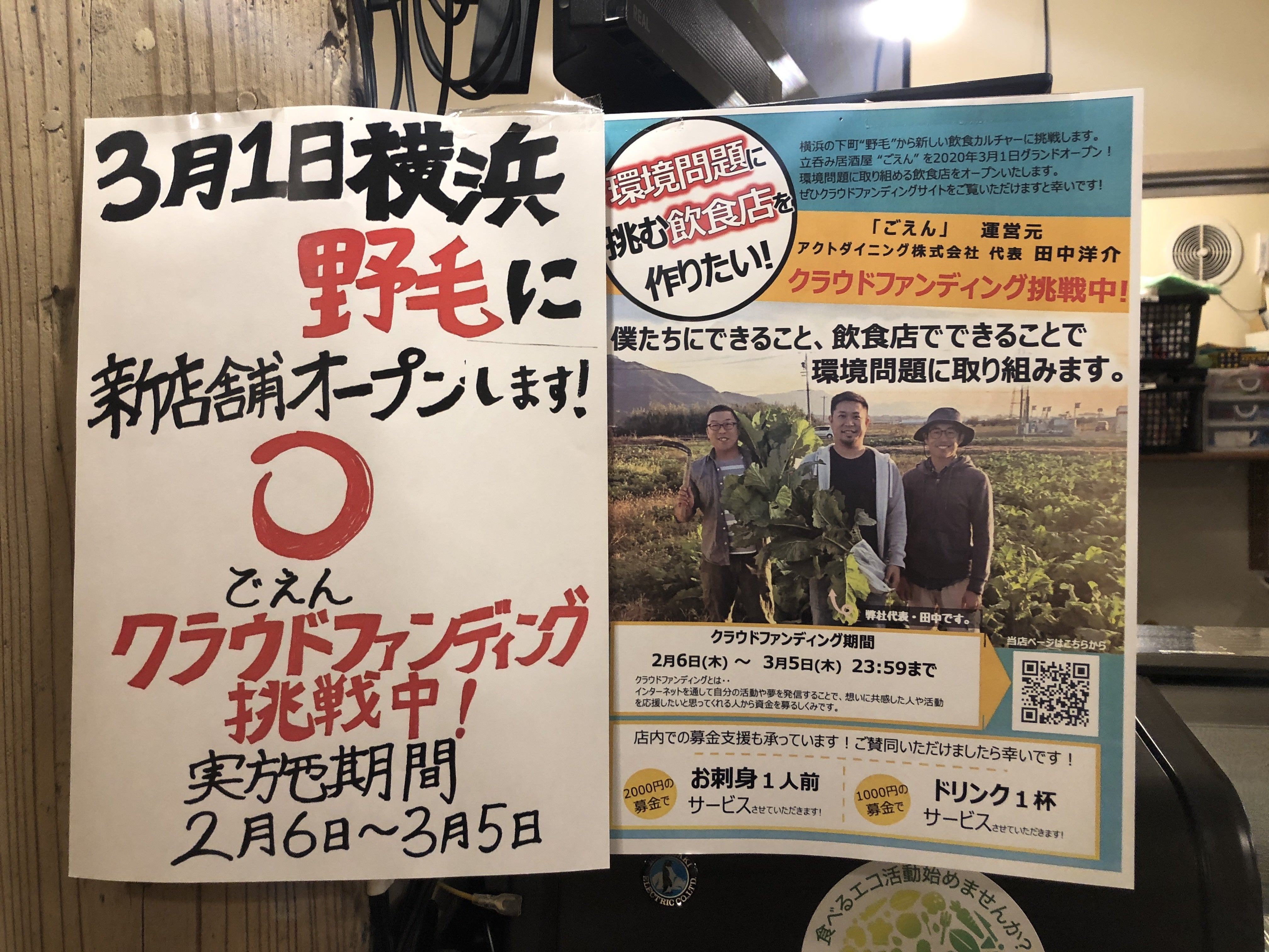 2020/03/04 18:00投稿が数日空いてしまいましたが、その間に支援者数が50人を超えました!!皆さん一人一人のご支援が本当に本当に嬉しいです!みなさん、本当にありがとうございます!=======================立呑居酒屋“ごえん”グランドオープン!=======================3月1日、立呑居酒屋“ごえん”をグランドオープンすることができました!当日はたくさんのお客さんに来て頂き、祝い花もたくさん届きました。皆さんありがとうございます!アクトダイニング6店舗目のお店となりました。10坪という小さなお店ではありますが、ここで環境問題に取り組む店舗作りに新たに挑戦していきます。食材、内装、器、洗剤などさまざまな観点から環境問題に繋がるものを選んでいくように心がけています。値段で選んでいた今までから、一つ選択肢を増やして考えていくことの大切さを感じています。バナナペーパーで作られたショップカード新鮮なお魚や野菜を用意してお待ちしておりますので、ぜひ、皆さん店舗に遊びにきてくださいね!ドリンクも各種ご用意してます!そして、このプロジェクトも明日で終了です。泣いても笑っても残り30時間。僕たちの力だけでは全ての人に届けられないので、皆さんのお力をお借りできると嬉しいです。本プロジェクトの存在を、身近な人への連絡の際に添えていただいたり、SNSで拡散していただいたりしていただけると、とっても嬉しいです!それでは最後まで引き続きよろしくお願いします!!! もっと見る【残り6日間】“ごえん”のコアコンセプトについて