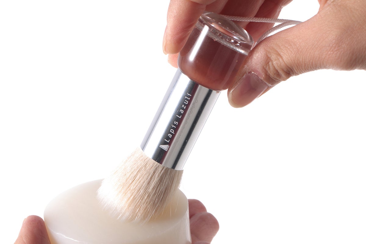 洗顔ネット要らずでヌルヌルとした泡を作り出すLLモイストベールソープの良さを生かし、広島県の伝統工芸品「熊野筆」の老舗工場である竹宝堂様へご協力を仰ぎ、1年以上の月日を経てようやく生まれたラピスラズリだけのオリジナルアイテムが、このLLフェイスケアブラシです。