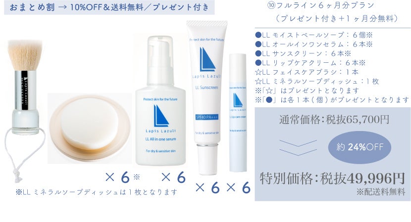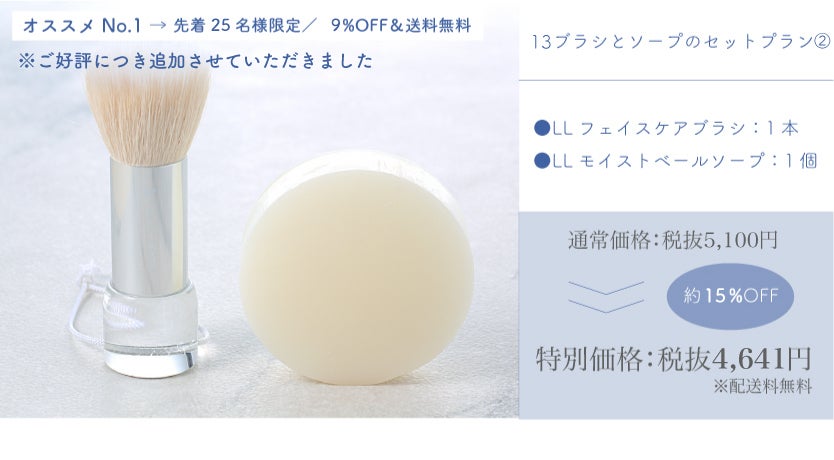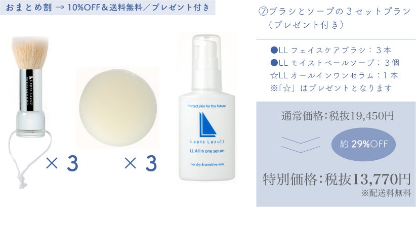 より多くの皆様にラピスラズリというブランドを知っていただきたいという想いから、新製品のLLフェイスケアブラシだけでなく、合わせてお使いいただきたい美容石鹸のLLモイストベールソープを始め、フルラインナップまで含めた様々なリターンをクラウドファンディングだけの特別価格にてご用意いたしました。