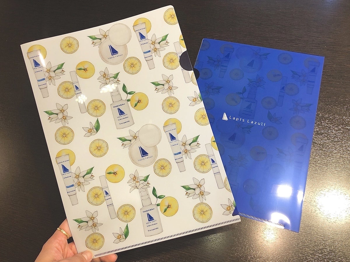 A5サイズのクリアファイルにラピスラズリのアイテムとユズの実と花のイラストがプリントされております。