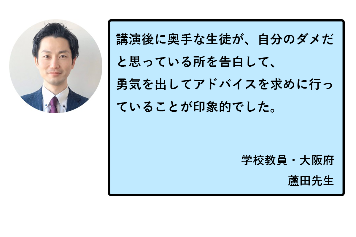授業を受けて、実際に行動を起こすようになった生徒の方もいらっしゃいます。一人の例を紹介させてください。