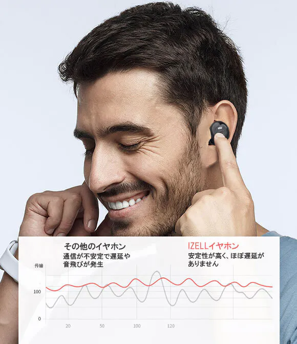音声通信が左右のイヤホンに伝わるため遅延や音飛びが少ないのが特徴です。