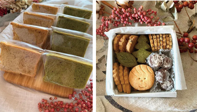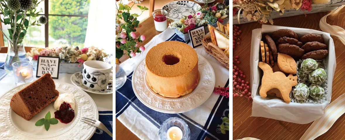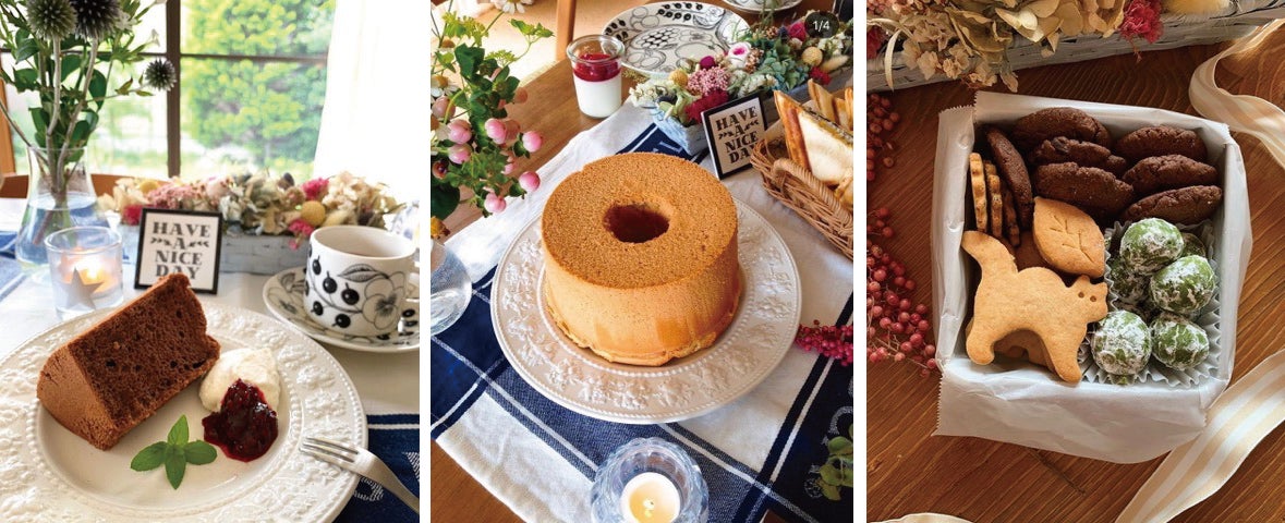 今までは2ヶ月に一回のイベント時にしか食べることが出来なかったシフォンケーキや焼き菓子。四種のシフォンケーキ(左下)、焼き菓子詰め合わせセット(右下)をもっと手軽に食べることが出来るようになります。イベント出店も予定しているので、今まで以上に購入のチャンスが広がると思います!