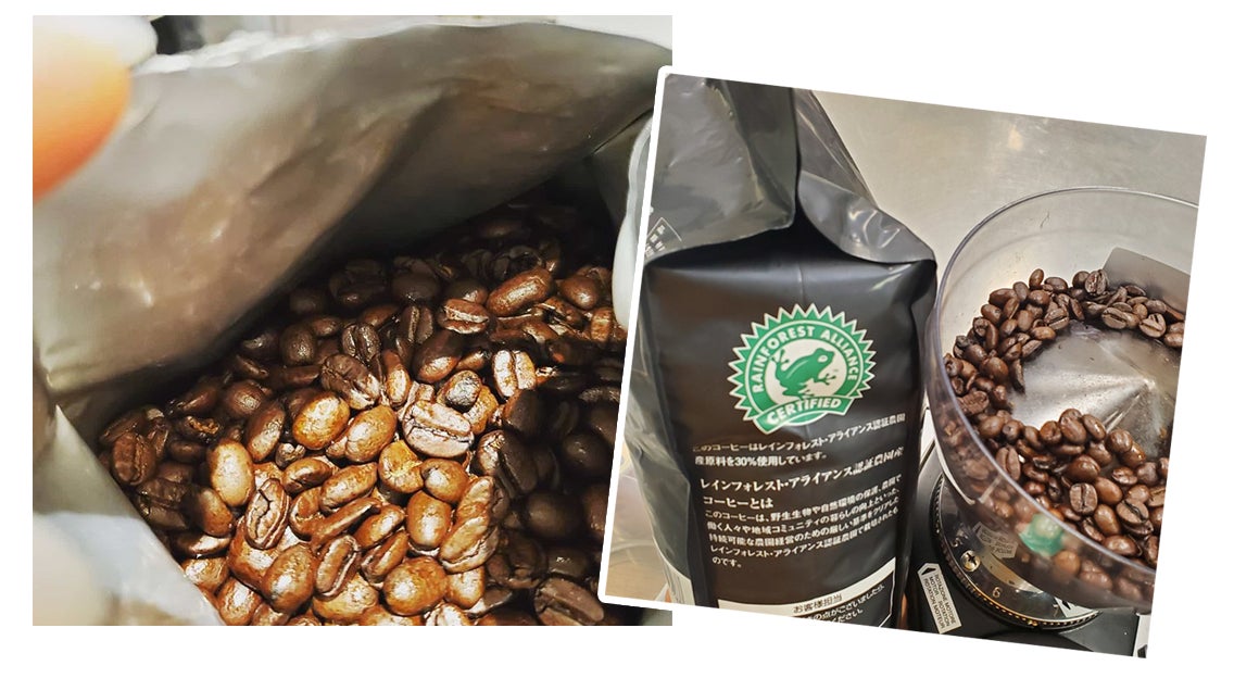 コーヒー豆:お店で使用する特選のプレミアムロースト豆。めちゃくちゃ香ばしい深煎りです。人と環境も幸せにする 「レインフォレスト・アライアンス」認証豆。