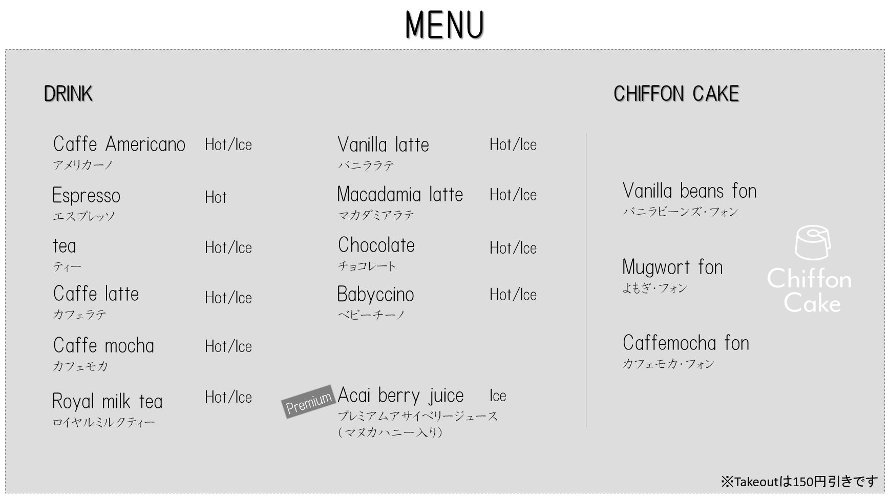 ケーキセット無料チケット:店内でお好きなシフォンケーキとドリンクがお楽しみいただけます。