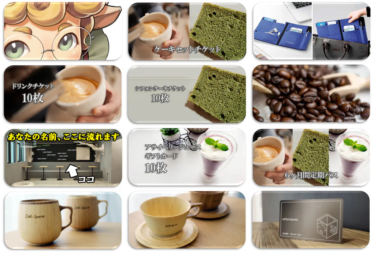 店内に映像にお名前を載せる:スペシャルサンクスとして3ヶ月間、店内に映像のなかにお名前を表示させていただきます。リトルスクエアの創業に力添えした証として友人、知人に自慢できるに違いない!