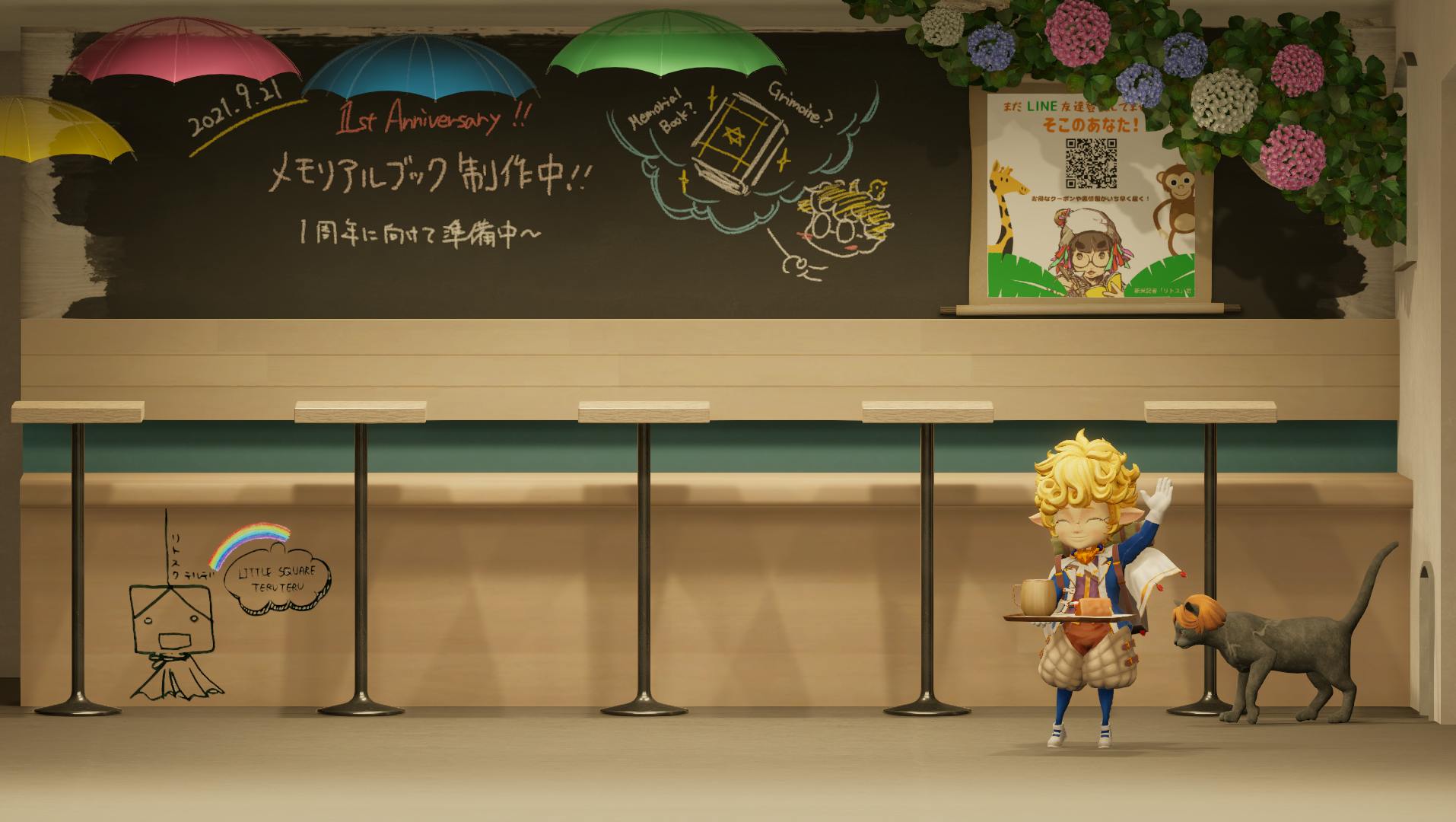 2021/07/04 17:17こんにちは! カフェ「LITTLE SQUARE」のオーナーです。じめじめとした天気が続いていますが、皆さんいかがお過ごしでしょうか。LITTLE SQUAREの店内もすっかり梅雨模様。アジサイが咲いたりカラフルな傘がくるくるまわったり…。雨続きは嬉しくはないけど避けられないなら楽しんだ方がいいですもんね。椅子のところにはオーナーが落書きしたテルテル坊主も♪早く晴れの日が戻ってくるといいですね。(この子、実は瞬きしますフフ…さて!皆さんから応援いただいたおかげで大きな一歩を踏み出すことができた夢のカフェ「LITTLE SQUARE」はコロナ禍の中たくましく開業し、気づけば9月で「1周年」を迎えます。恐ろしいです… もう1年なのですね。(まだ5か月ぐらいの感覚でいました)目まぐるしくバタバタわちゃわちゃ走ってきました。新型コロナウイルスというラスボス級の障害があったからでしょうか。カフェの形を維持して迎える1周年がこんなに特別に思えるとは。なのでわたくし、1周年はちょっと無理をして思い出に残ることをやりたいなぁと。そう!「本」を作ることにしました。1周年記念の本!魔導書のようなね! 持っていたくなるオシャレで不思議なこだわりの本を。7人の素敵な仲間で作っています♪本づくりは初めてで工程も相場もわかりませんでしたが色んな方のアドバイスや助けのおかげで何とか徐々に形になってきています。本ってこうやって作るのですね~。やりたいことを遠慮なく盛り込んでみました。 (ハードカバーってこんなに高いと思わなかった!)今回の本を作るため、本制作のデザイナーさん以外にもイラストレーター、シナリオライターなど多職種の方に依頼を投げまくったのもあって、諸々合わせると本一冊の単価が7千円を超えてしまった事実に(@_@);ぶち当たったときは4秒ほど息が止まりましたが。大切な1周年ですから!ポケットマネーをかき集めてでもやりたくてw ま、楽しいですしね!今回の1周年本にはLITTLE SQUAREの開業までの道のりや裏話エピソードはもちろん、カフェにやってくる異世界住人がいったい何者なのか。(名前とかもよく聞かれるようになったので) 彼らの世界の話や描きおろしイラストなどなど!気になっていた「知りたい」が満載な本になりそうです。これからお店を始めようとしている方や、すでにリトスクのファンになってくださっている常連さん、オシャレな書物が好きな方、リトスクに少しだけ興味ある方など。様々な方に楽しんでいただける内容となっていますので是非9月を楽しみにしていてください^^そしてこの本はいろんな方を巻き込んで作りたくて!たくさんの方におめでとうのメッセージや作品をいただき、本に載せたいと思っています♪想像するだけでめちゃくちゃワクワクします!!良かったらあなたもぜひ一言エールを送ってくれませんか?♡↓↓1周年お祝いのメッセージを書くとっても特別な1冊になるに違いありません。これからもコロナにも雨にも負けず、「リトスクに来るとなんかいい…♡」を目指して! 日常の中の非日常を作り続けていきたいと思います。暖かく見守ってください。ではまた楽しい進捗をもって報告に来ますね。体にはお気をつけて。 もっと見る
