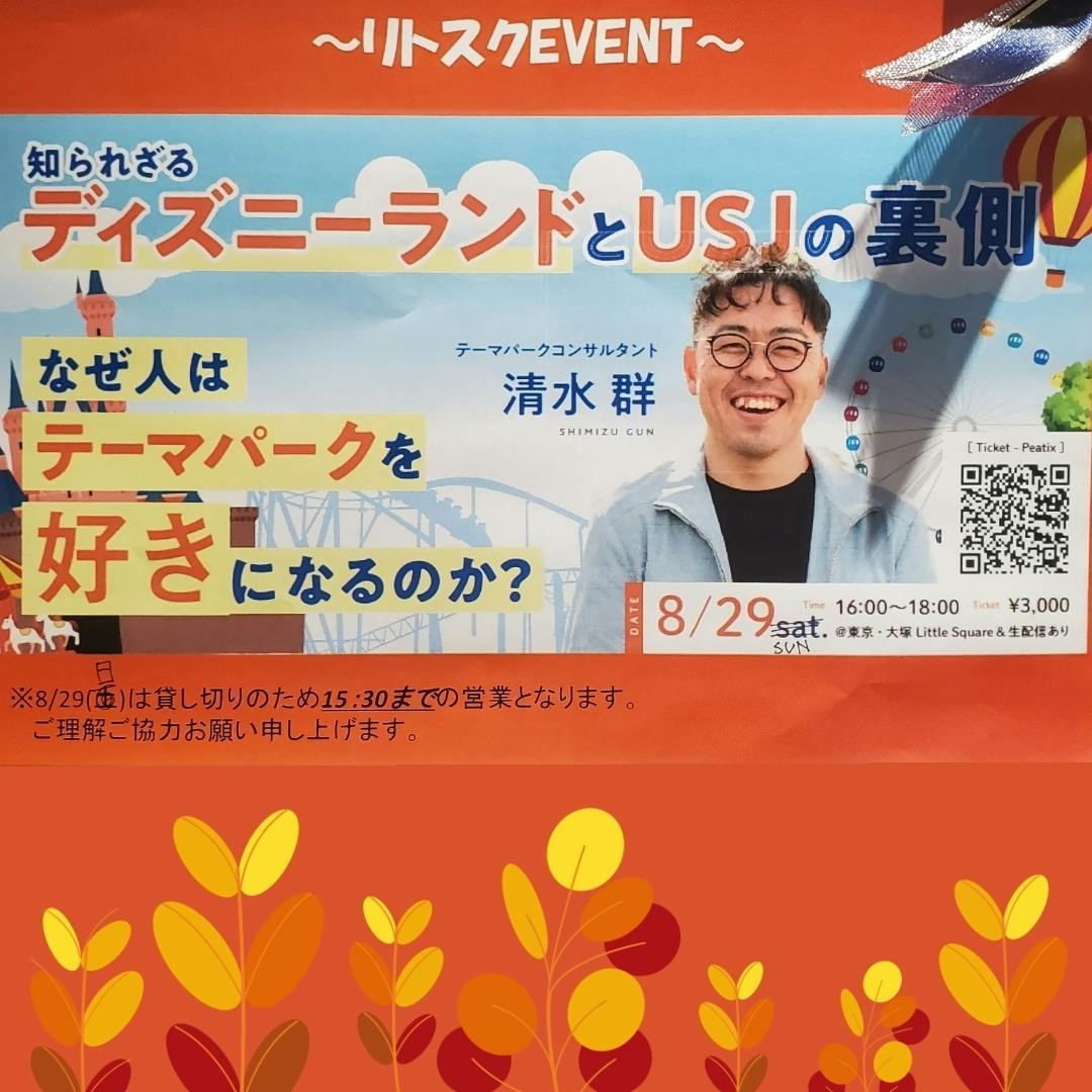 2021/08/23 13:42カフェLITTLE SQUAREはまもなく一周年!たくさんの方が応援してくださっているお陰で、今の飲食店暗黒時代のなかでもなんとか頑張ってやっています。さて、LITTLE SQUAREは「カフェアトラクション」と自称しているように楽しいことがたくさん起こる場所でありたくて様々な取り組みを行っています。この度、奇跡的なご縁となりディズニーランド、USJを作ったテーマパークコンサルタントの方に、皆がまだ知らないディズニー&USJの裏側の話を聞かせていただくことになったんです…!!「ジャングルクルーズの隠された秘密、ホテルミラコスタが建てられた時、まさかそんなこだわりがあったなんて...!」世界を代表するテーマパークを作る裏側にはどんな秘密とこだわりがあったのか。そんなすさまじい話が聞けるんですって。サービスに従者する方、経営者のみなさん、お子さんと一緒でも楽しめて大事ななにかが学べる貴重な講演会。会場は人数を絞って行っているのでオンラインもおすすめです。興味ある方、まわりに興味ありそうな方いたら是非覗いてみてください。今週の日曜日16時から!詳細を見るP.S.先日TBSの東大王という番組の遊園地偏で専門家の方として1時間出演されていました(Wow!) もっと見る