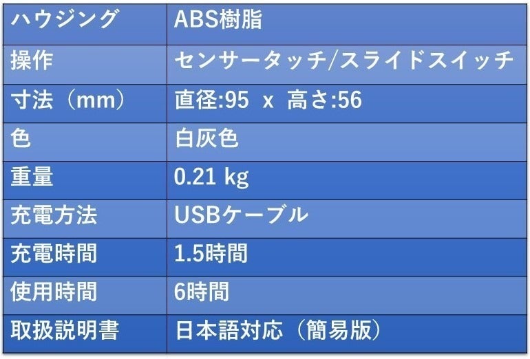 付属のUSBケーブルで充電が可能です。(フル充電時間:1.5時間、使用可能時間:6時間)