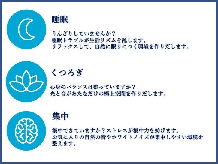 お気に入りの自然の音やホワイトノイズを流すことで気になる騒音から解放され、気持ちが落ち着き、眠りやすくなる環境を整えます。