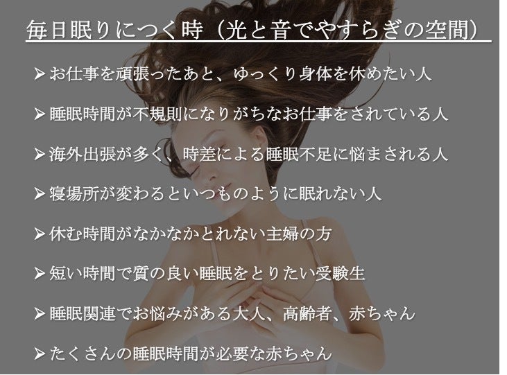普段から寝つきが悪い人、環境が変わると寝付けない人、仕事柄いつも同じ時間サイクルで眠れない人、よく泣く赤ちゃんなど、眠りに問題を抱えている人には効果的にお使いいただけます。
