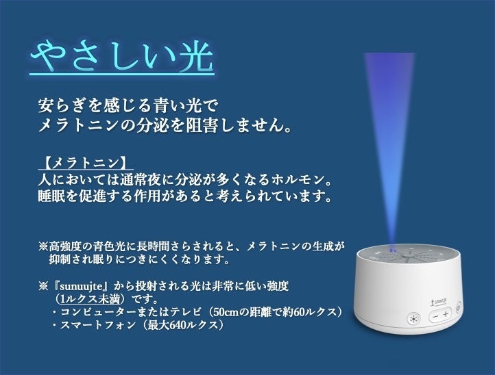 睡眠を妨げない目に優しい明るさの光を照射していますので、天井に映る光を見ることで目を傷めることはありません。光を直接見たり、長時間の使用は目を傷める可能性がありますので絶対におやめください。