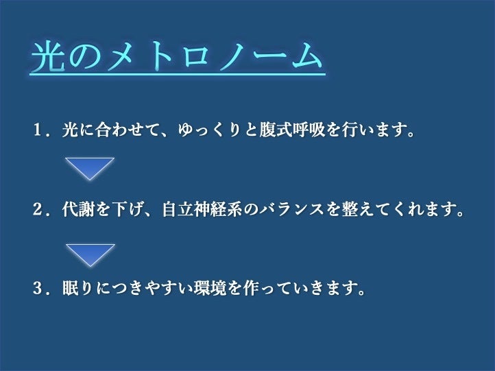 呼吸を整えることで眠りにつきやすくなる人は、大小に変化する光(光のメトロノーム)に合わせて呼吸をする必要がありますので、そのリズムに慣れるまで時間がかかる場合もあるかと思います。