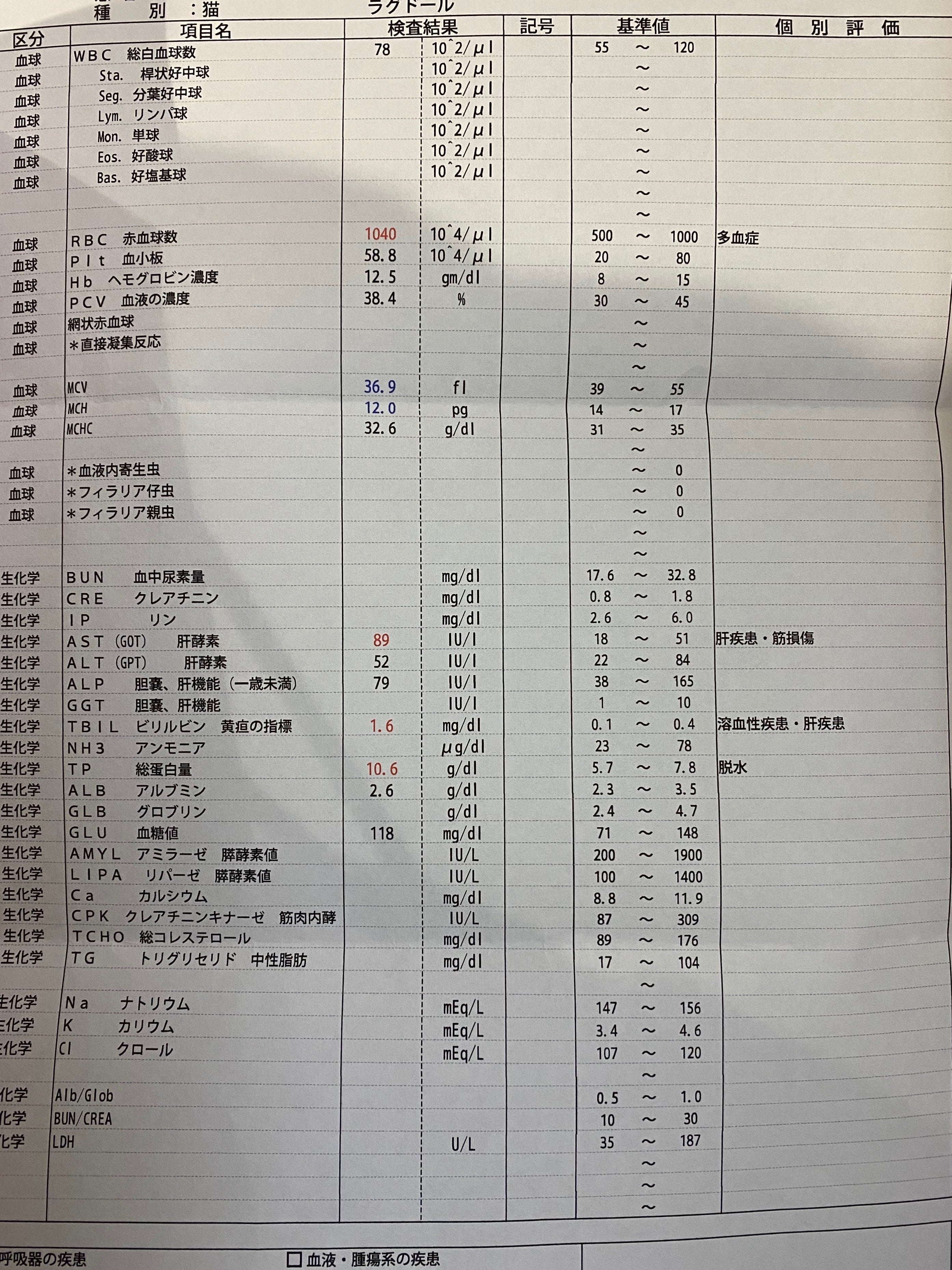 1月31日に去勢手術のため、血液検査を行い、2月3日に電話があり、「命に別状がある物ではないが、血液検査に高い物と、低い物がある」と言われました。