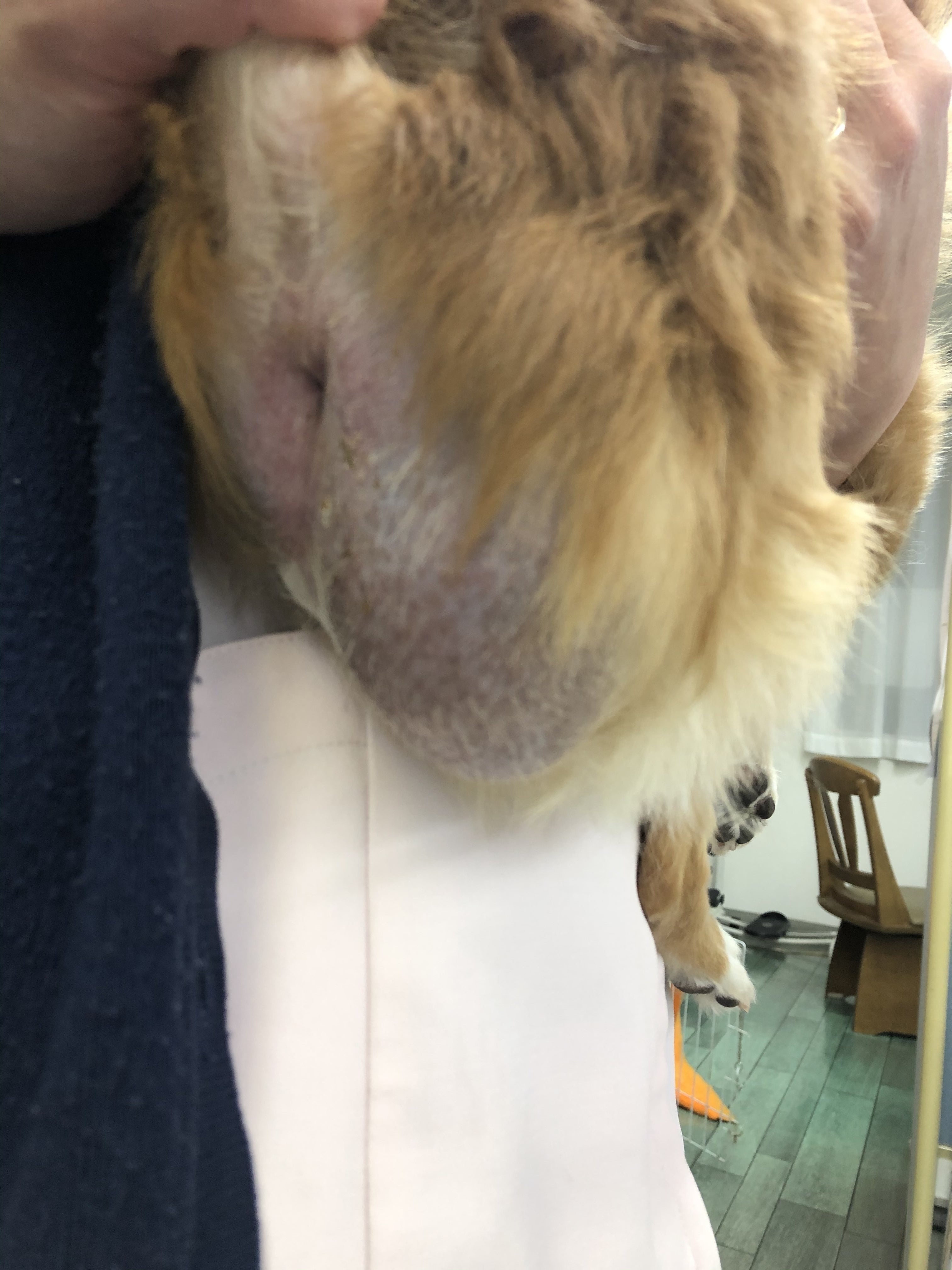 ・会陰部ヘルニアは、左右あるが、これは去勢をしてない為のホルモンの関係で筋肉が薄くなり、穴が空いている状態。ダイちゃんの場合、左にも腸が出ているが、特に右側に腸と陰茎の根元がが入り込んでいる為、右側が大きい。未去勢の吠える子に多い疾患です。