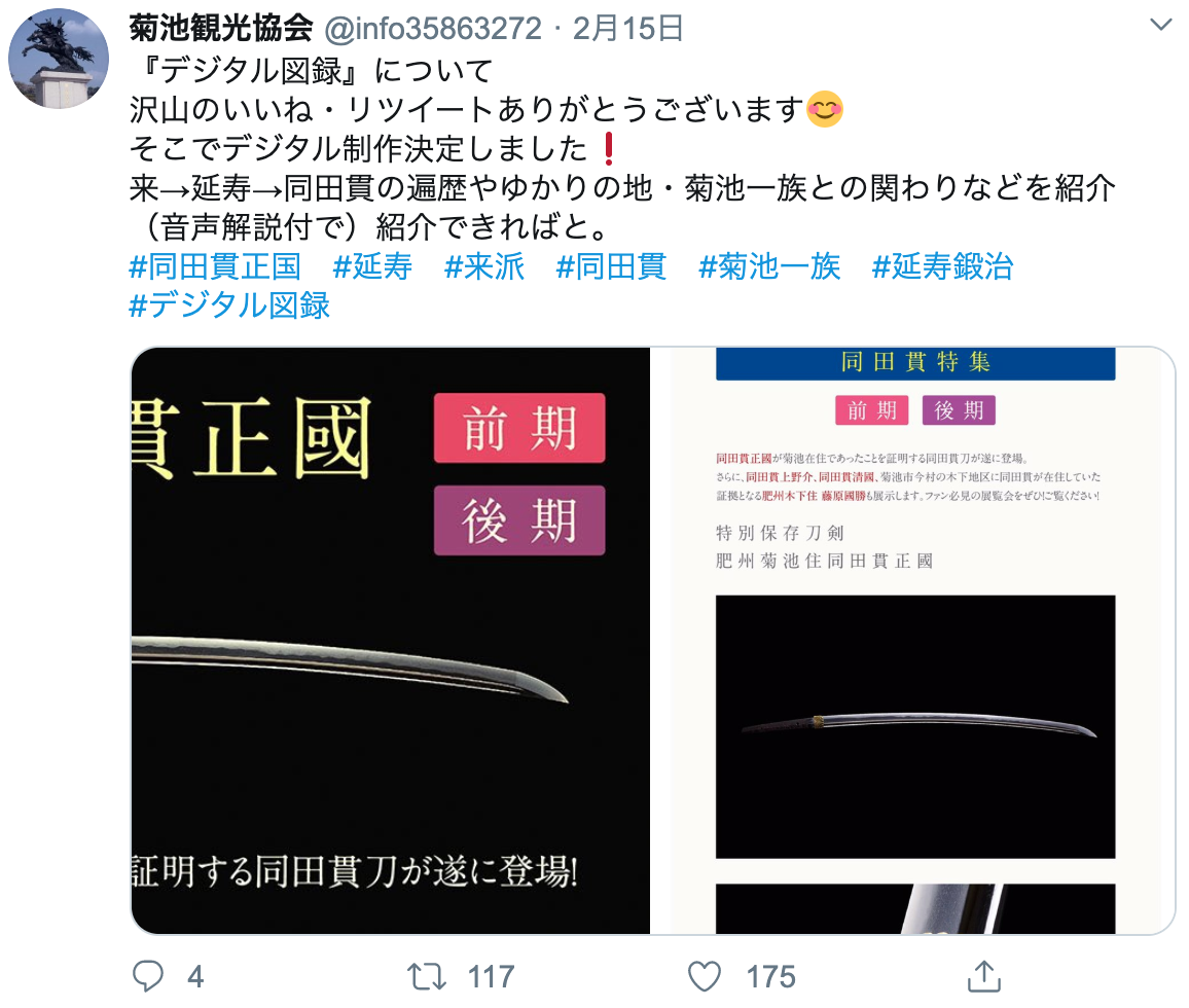 そこで、菊池観光協会のTwitterにて、図録について皆さまのご意見をお聞きしたところ、多くのいいね、リツイート、コメント頂きました。ありがとうございます。実行委員会で緊急会議。皆様の要望に応えたい一念で、『デジタル図録』同田貫DVD制作を決定!