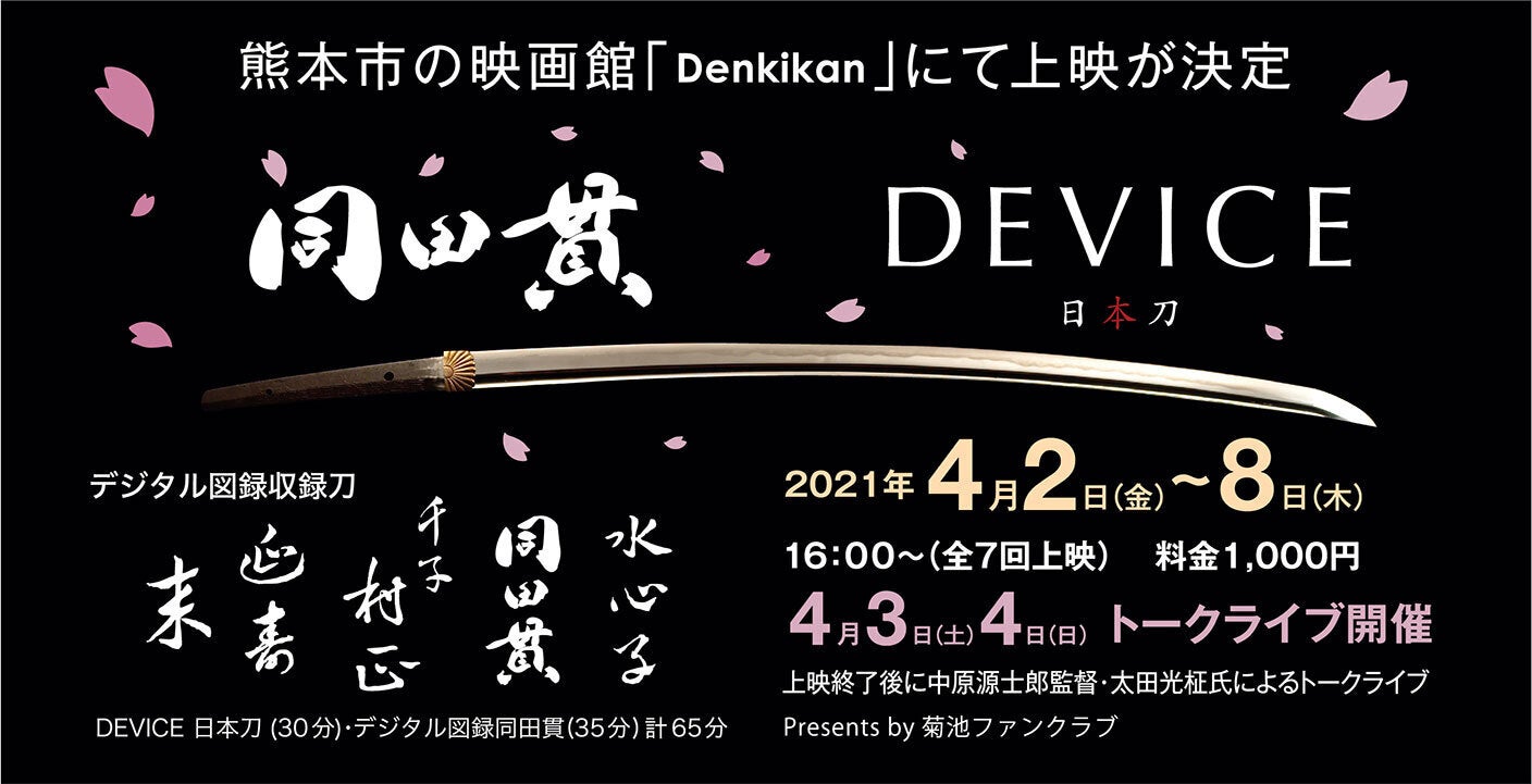2021/04/01 16:03菊池一族まつり 工藤です。いよいよデジタル図録「同田貫」と「DEVICE日本刀」の2作品がスクリーンデビュー致します!熊本市内にございます老舗映画館Denkikanにて4月2日~8日(7日間)16:00~上映です。パトロンの皆様と作り上げた「同田貫」そして、戦の遍歴と共に進化した日本刀を紹介する「DEVICE日本刀」を大画面・大音量にてお楽しみ頂けます。是非この機会に、劇場にてお楽しみ下さい!また、劇場では、菊池一族まつりのグッズや、先日創立した菊池ファンクラブグッズ、刀剣関係の書籍等の物販もあります。こちらもお楽しみに!Denkikan公式HP→ https://www.denkikan.com/菊池一族と延寿鍛冶展HP→ https://www.enjukaji.jp/菊池ファンクラブHP→ https://kikuchi-fan.com/菊池観光協会Twitter→ @info35863272 もっと見る