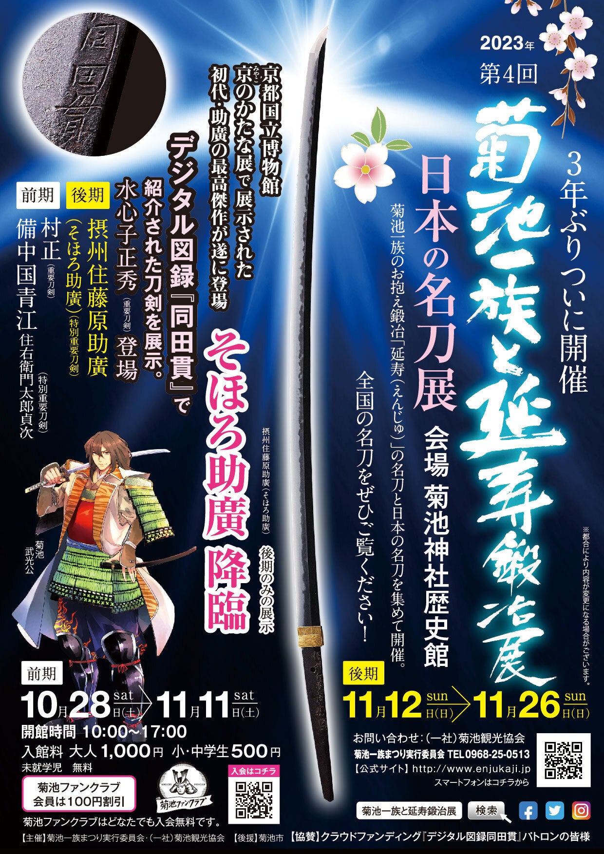 2023/09/03 10:00多くの皆様にご支援頂いた「デジタル図録同田貫」プロジェクト。その発表の場になるはずだった第4回菊池一族と延寿鍛冶展が3年の延期期間を経て開催する事が決定しました!世の中を一変した新型コロナ感染症。熊本地震からの困難を乗り越えた菊池一族と延寿鍛冶展は、更なる困難に直面することとなりました...。しかし、多くのパトロンの皆様に差支えられ、菊池の地で開催出来ない間も「菊池一族と延寿鍛冶展2020‐ONLINE‐ DEVICE日本刀」・YouTubeライブ「菊池一族まつり2022クロストークショー」などで、延寿・同田貫の魅力を発信して参りました。そして、いよいよ2023年10月28日~11月26日 熊本県菊池市菊池神社歴史館にて開催する事が決定しました!やっと皆様とお会いすることが出来ます!3年前のポスターには書けなかった、パトロンの皆様のことも表記することが叶いました!是非、この機会に延寿・同田貫の里 菊池市へお越しくださいませ。実行委員一同、皆様とお会いできること楽しみにしております!菊池一族まつり実行委員会 工藤 もっと見る