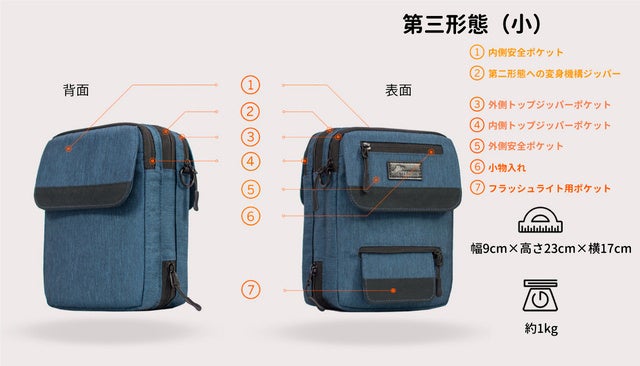 丈夫な1つのジッパーで簡単に第一形態(大)から第二形態(中)に変身!