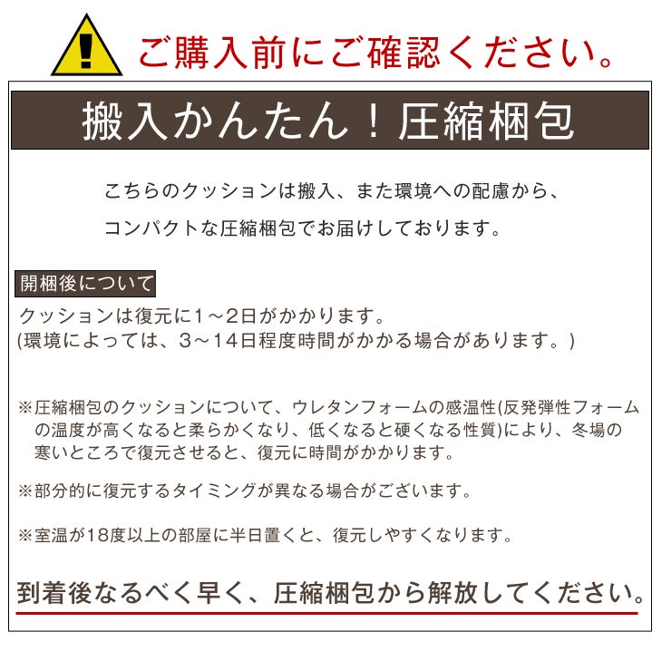 A:商品のサイズはロット・測り方によって、若干異なる場合がございます。また圧縮してのお届けとなるので、復元に1~2日かかります。