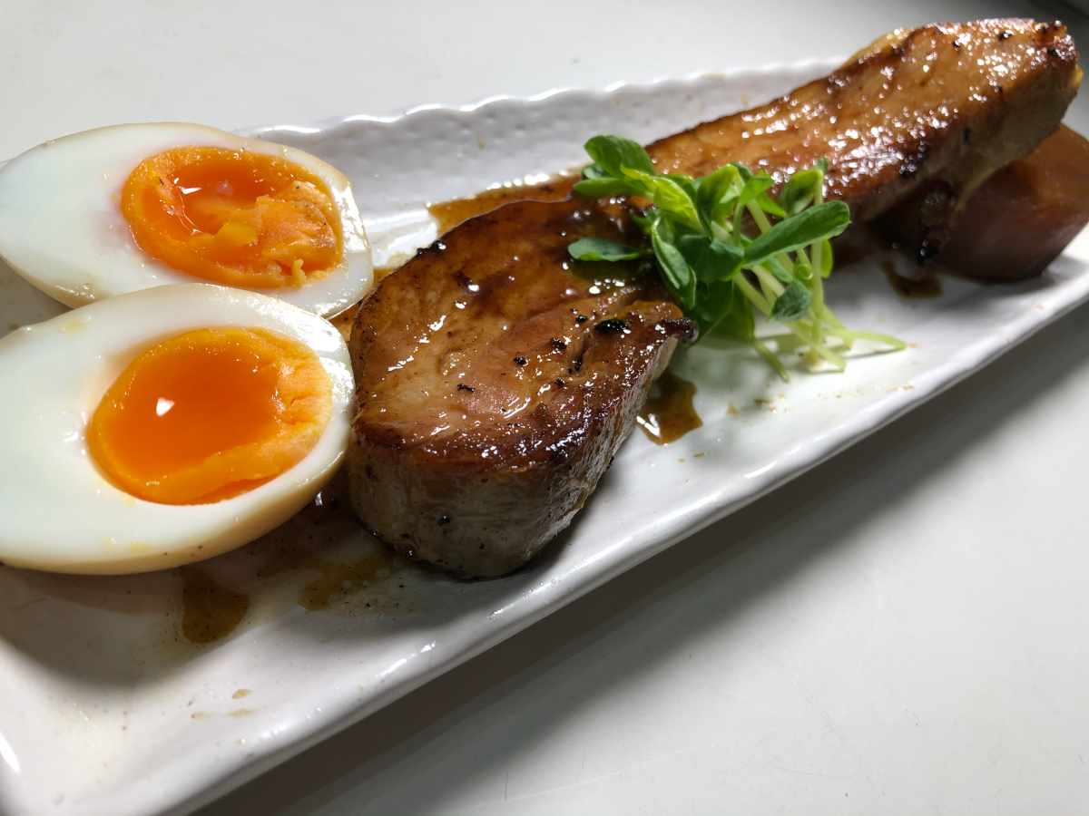 (軟らかく煮て、香ばしく焼き上げた角煮ステーキ)