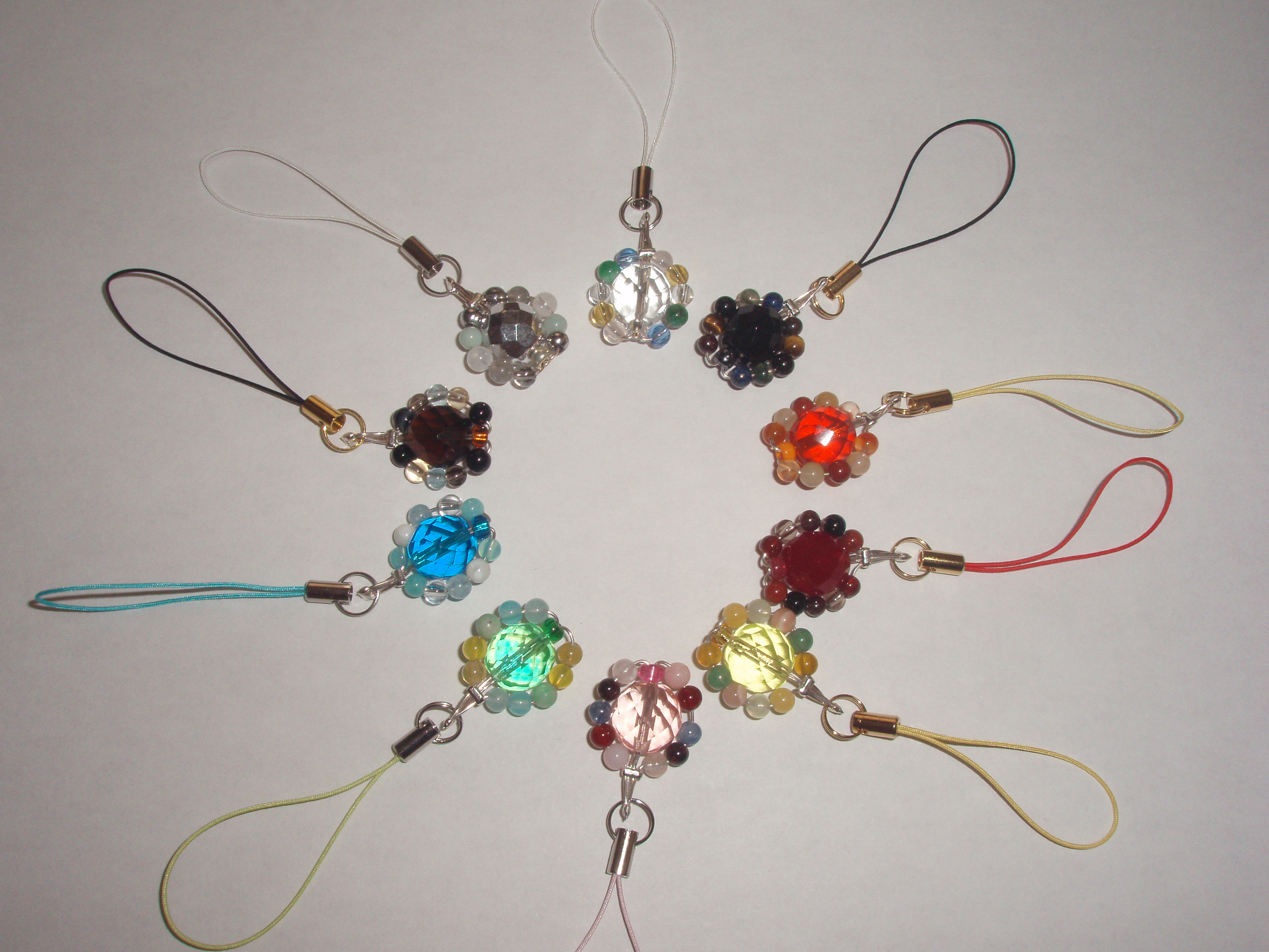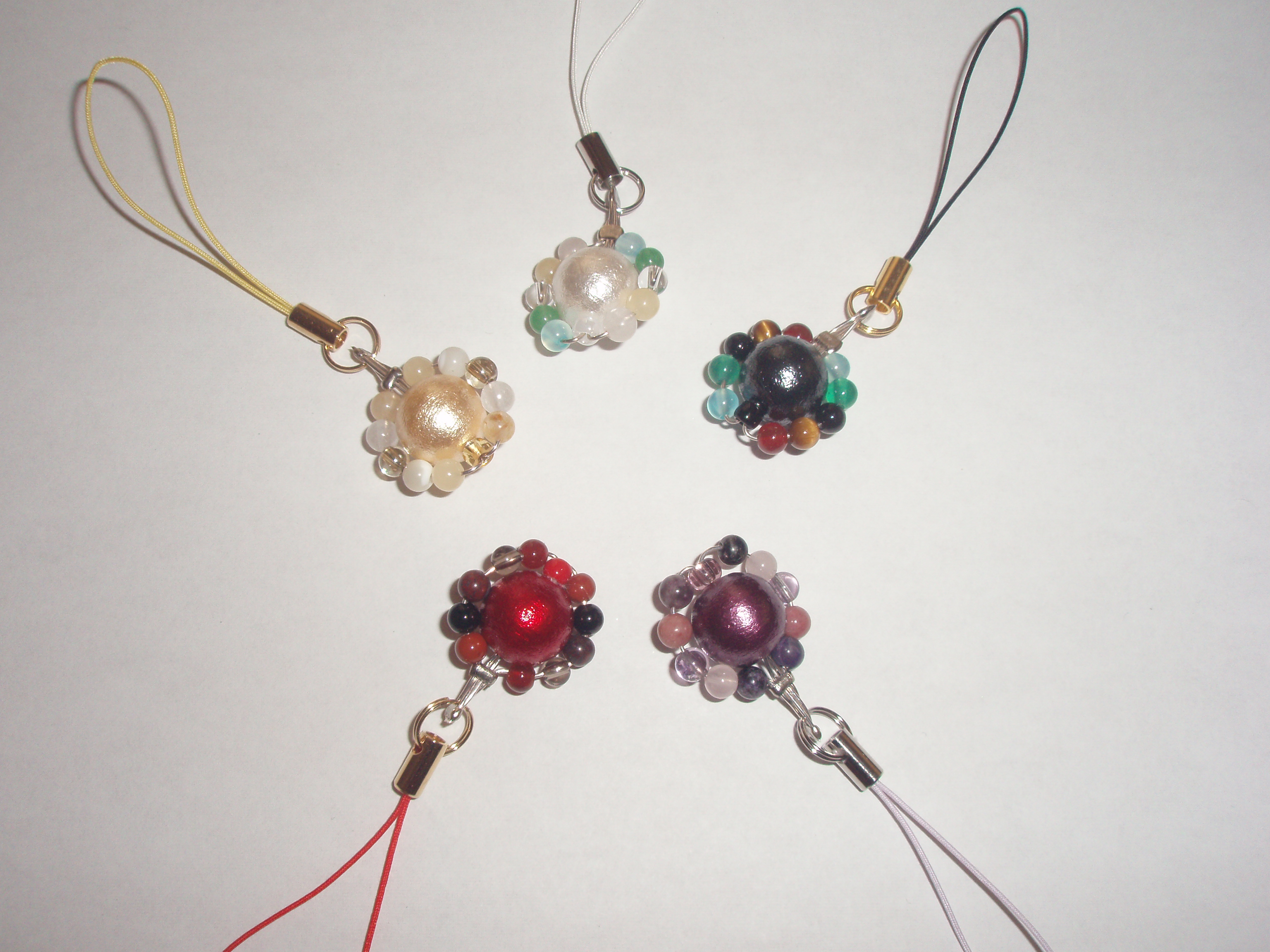 このほたる玉は黒地に青と水色のタイプを使用してますが、他にも緑やピンク等、場合によっては多種多様なカラーリングの物があった り、地色が白のパターンや暗所で輝く夜光タイプ等、千差万別のほたる玉があり、2号以降も様々なカラーリングのほたる玉を使用したストラップを作っていき たいと思います。