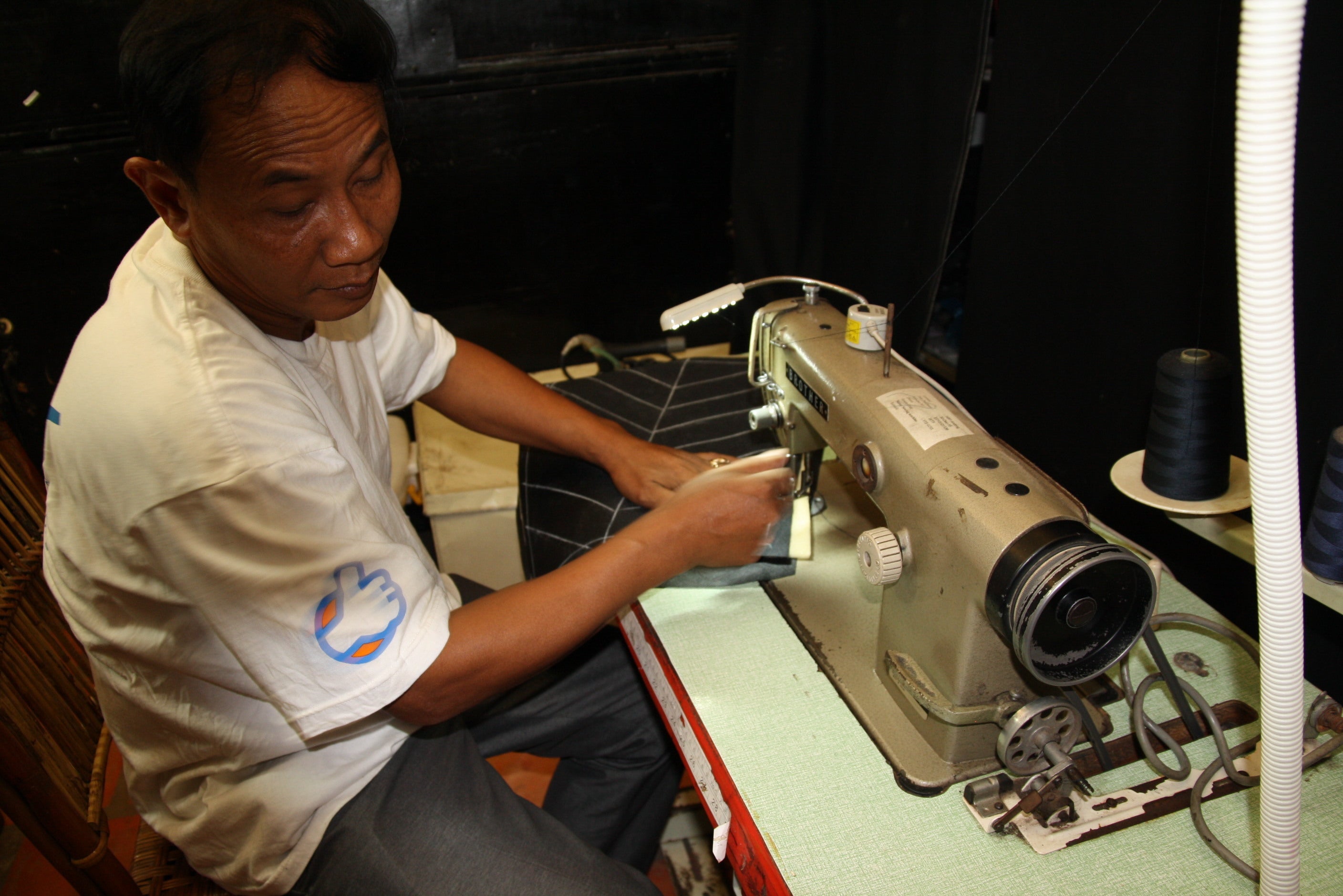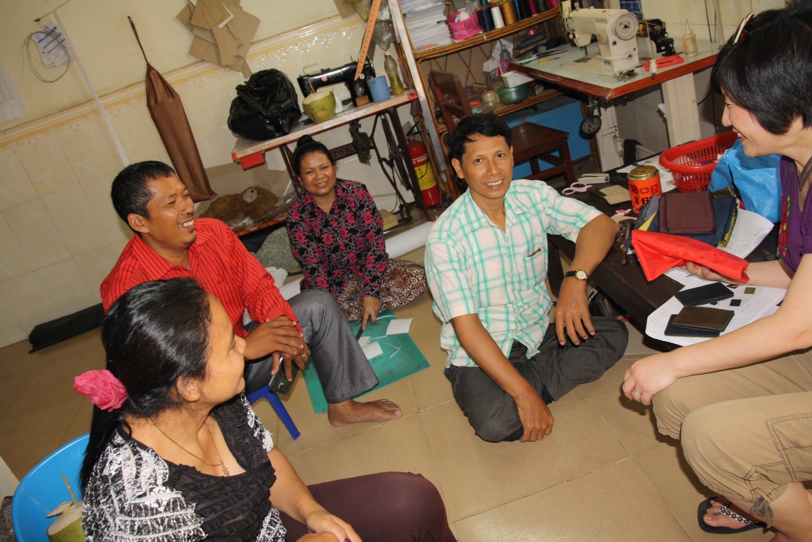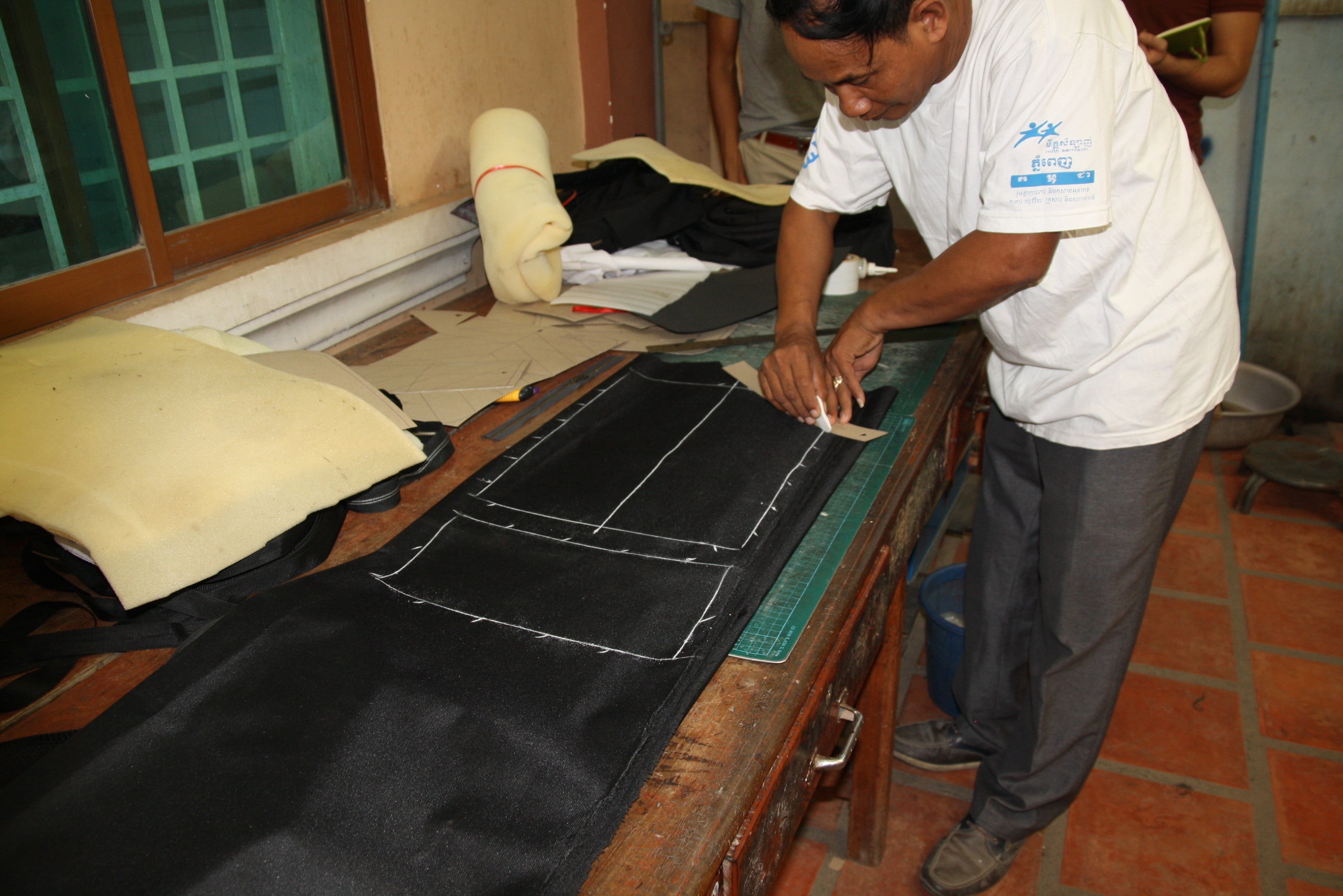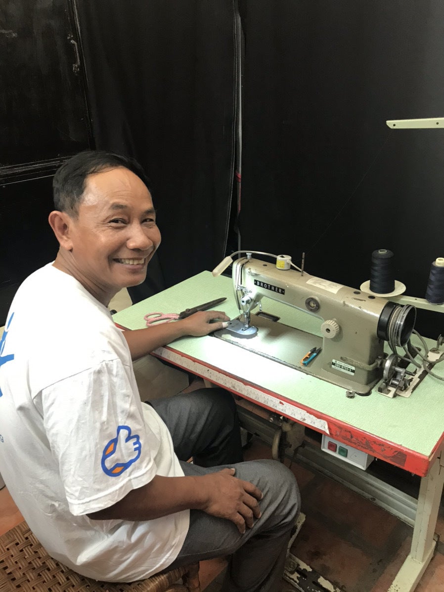縫製担当のサマンさん、片足が義足です商品の構造や、様々な技術、日本のマーケットを通じての気づきなどを共有し、彼ら自身が学び、スキルアップすることを、継続的にお手伝いしていきます。