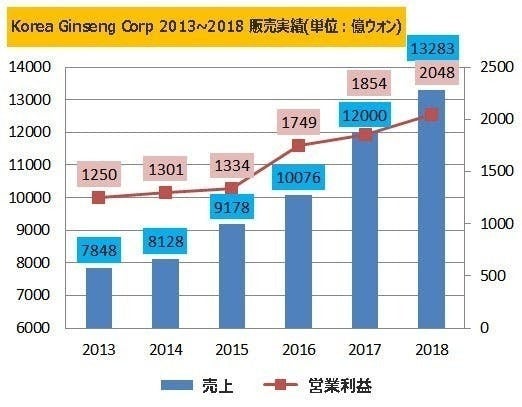 (韓国の高麗人参で最も有名な企業の売上高は毎年増えており、2018年度には約1千100億ウォンを達成)