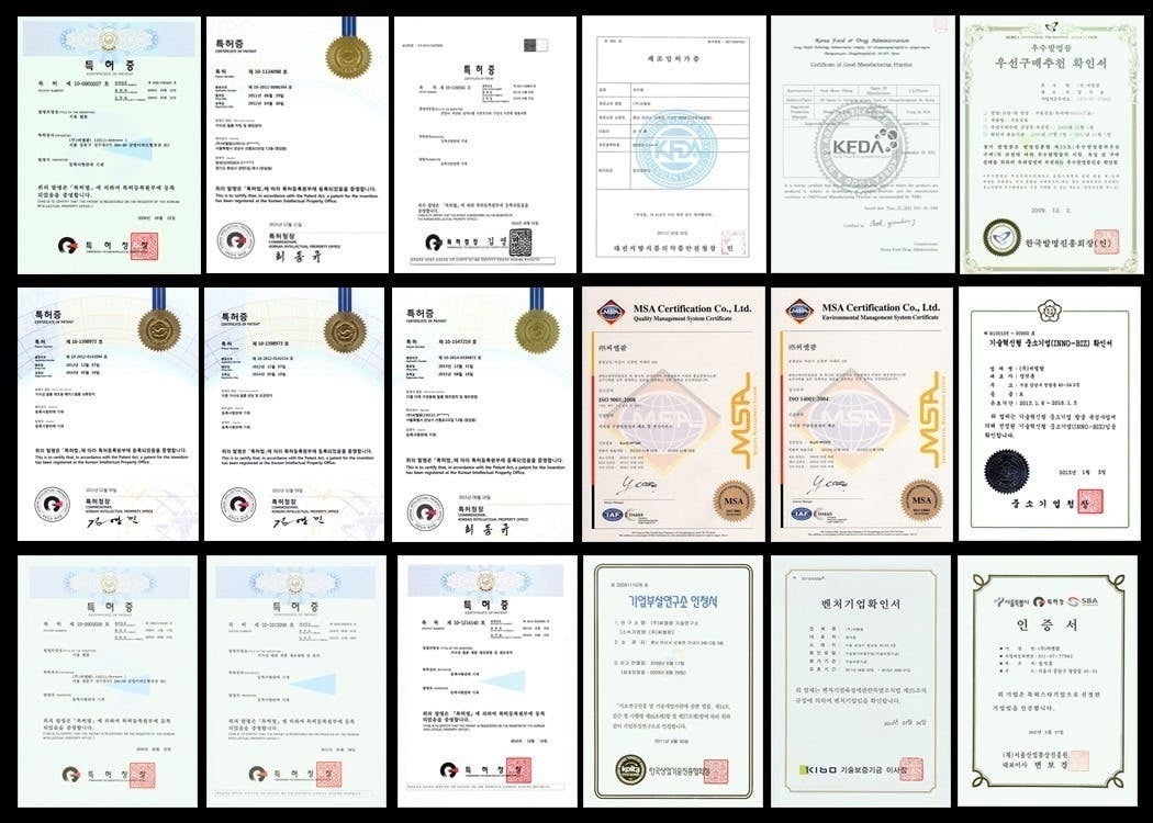 企業がこれだけの成長を遂げているのにはそれなりの理由があります。(株)シエルファームが製造する発酵紅参シートは、安全関連の認証および様々な特許を獲得した信頼できる商品です。