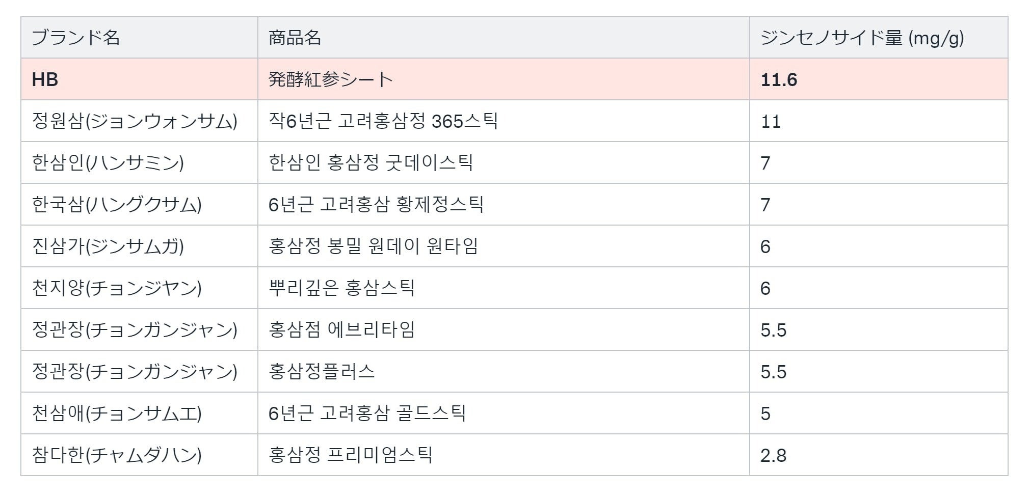 比較内容を見てみると、韓国で紅参商品を販売している企業より発酵紅参シートのジンセノサイド量が多く含まれていることがわかります。