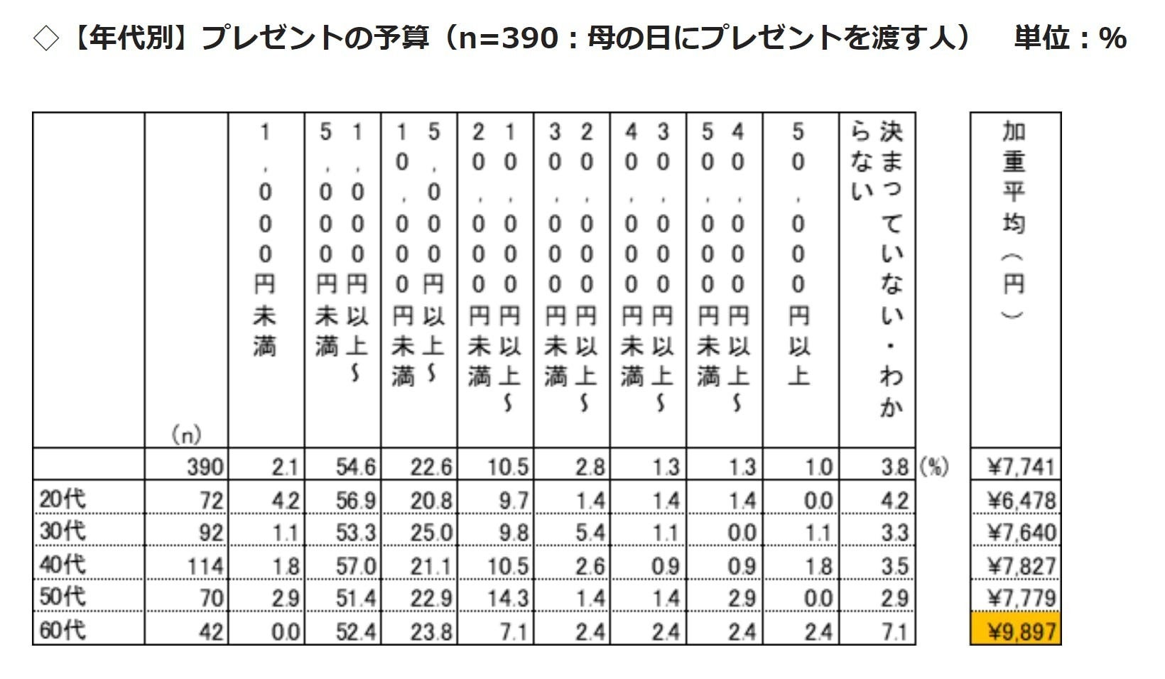 また、贈り物を送ると答えた人の予算を見てみると、年齢が上がるほど平均予算も上がることがわかりました。(最大平均9,897円)