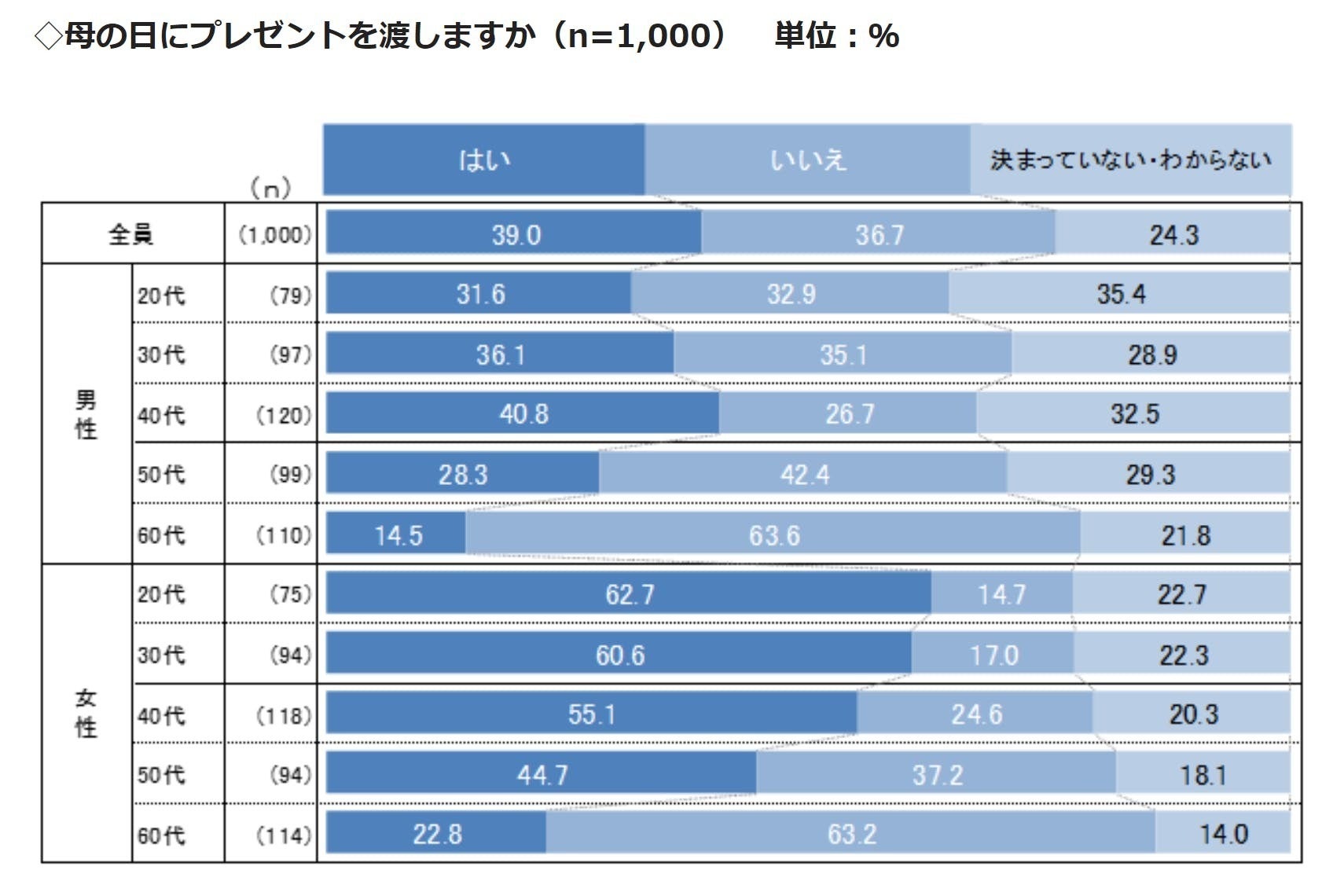 データを見てみると、男性に比べて女性の方が母親にプレゼントを送る方が多いようです。