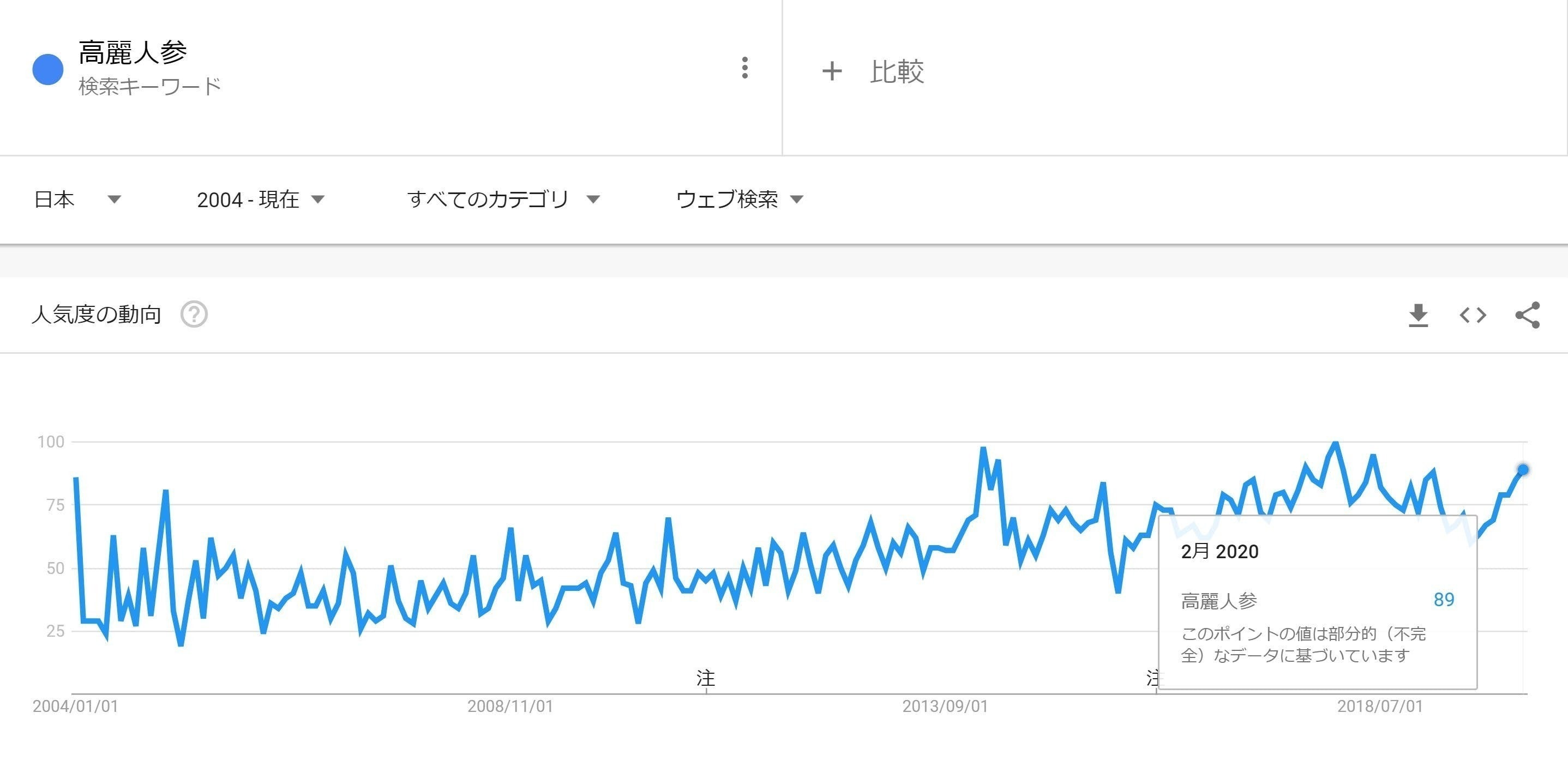 2018年度には前年比268億ウォンの海外輸出による売上を記録しており、2004年から高麗人参を検索するユーザーのトレンドを見ても、今後の紅参市場は期待されています。