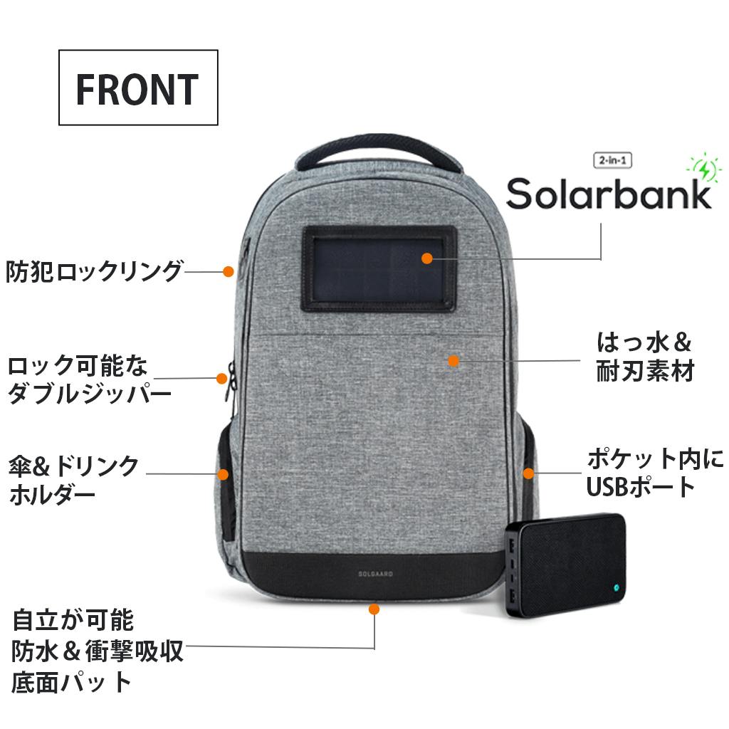 旧バージョンと新しくアップグレードした2.0の違いは、ソーラーバンクの改良(パネル性能アップ、スピーカーを排除して軽量化)、ナイフで貫通しない耐刃素材を使用、レインカバーの排除、スーツケースベルトの実装、ソーラーウィンドウカバーを追加、旧式だと破損率が高かったロックをより強固で壊れないワイヤー式にアップグレード、ジッパーを止水ファスナーに変更、デザインチェンジ、バッグの裏地がアップサイクル素材になります。