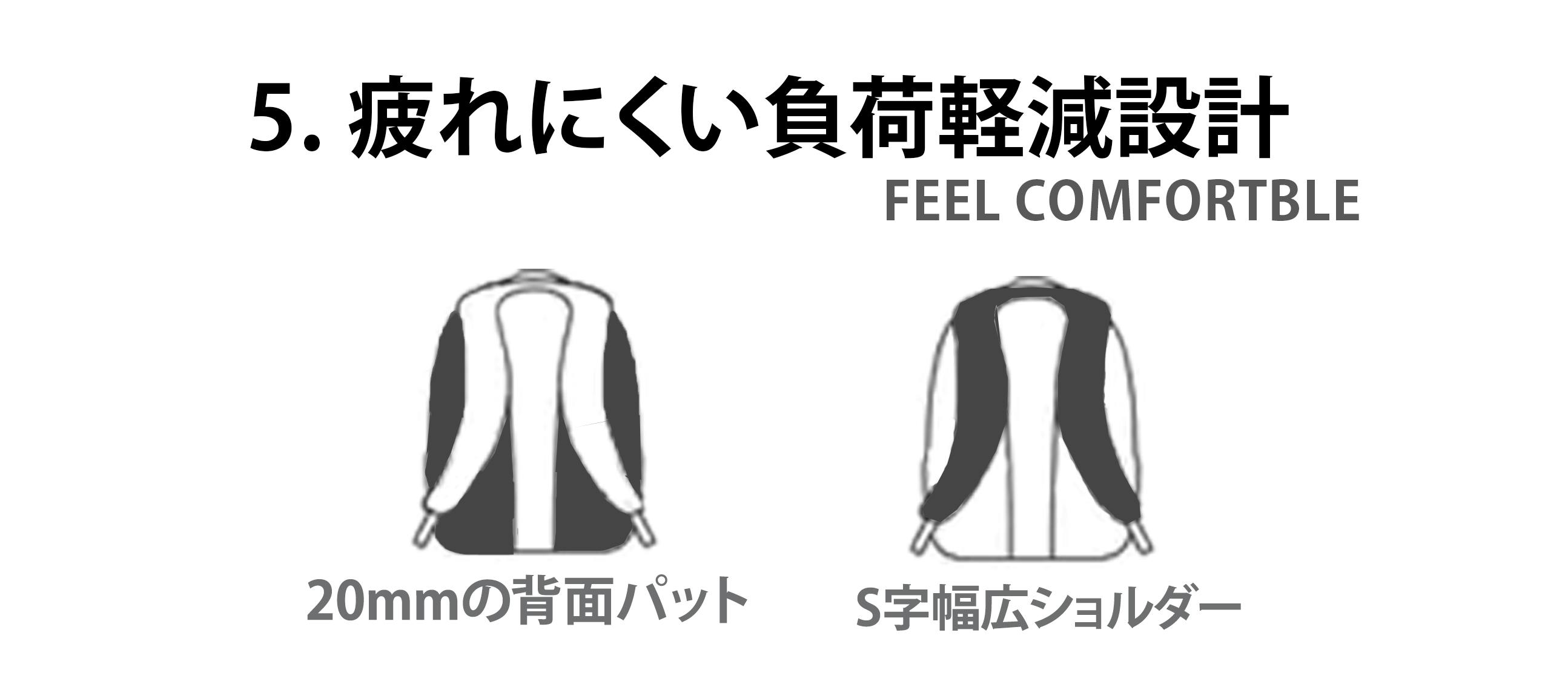 ・ぶ厚いクッションをショルダーと背部に入れることで疲れにくく背負える