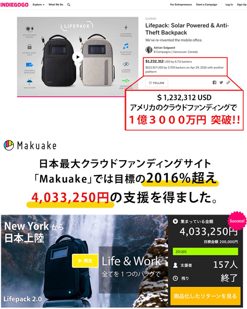 LIFEPACKは海外のクラウドファンディングで120万ドル(約1億3000万円)の支援獲得に成功して生まれました。その後、世界中の支援者や顧客からフィードバックを受けてオリジナルのLIFEPACKを進化させた『LIFEPACK2.0』をこれから紹介します。