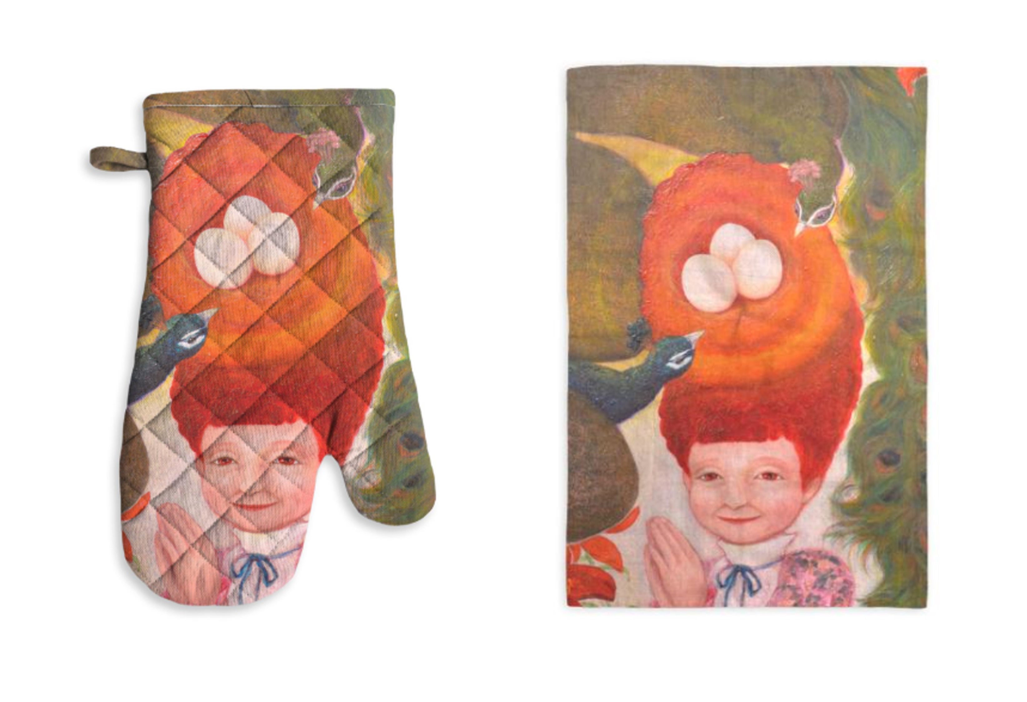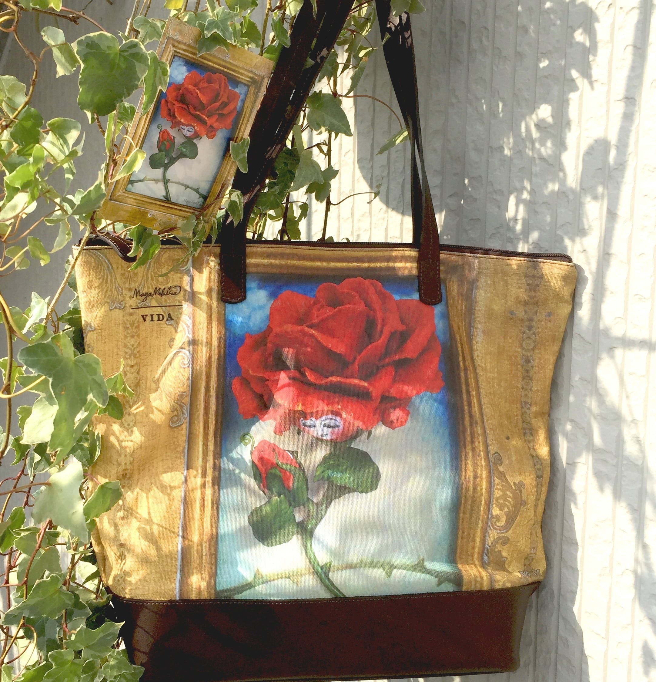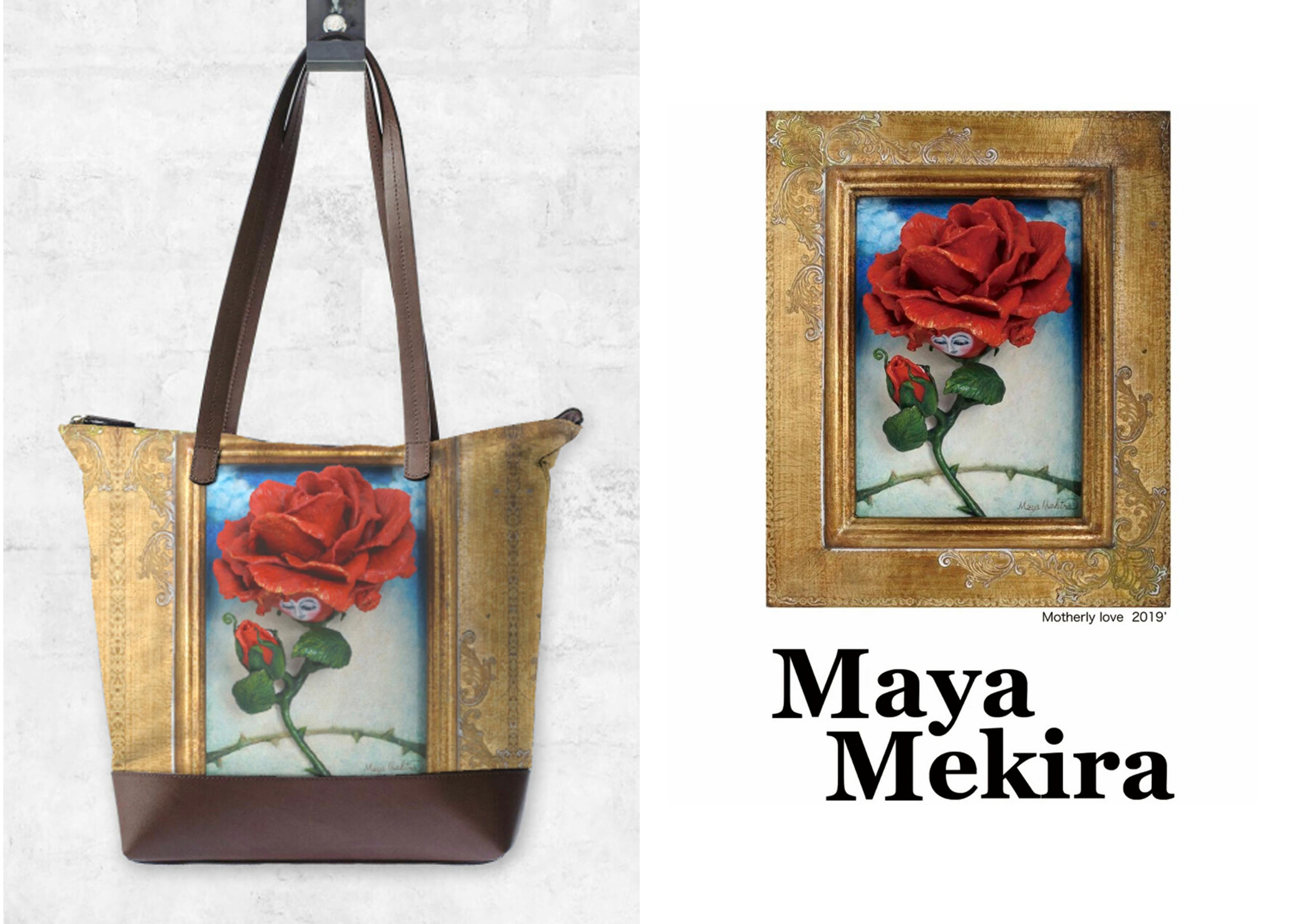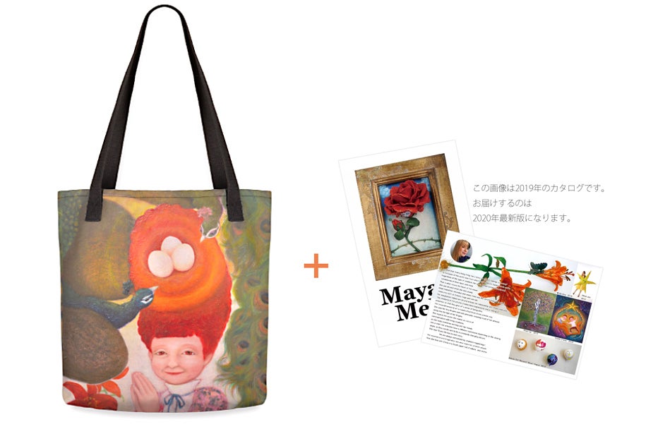 「Motherly love」の美しいプリントが施された大きめのバッグとサイン入りハガキをセットに。