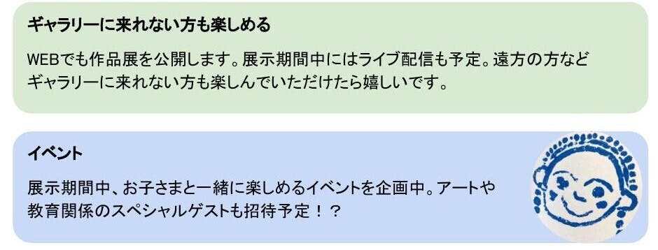 2021/01/26 11:06先週日曜、作品展が無事に終了しました。6日間でなんと111名ものみなさまにお越しいただきました!すごい…。このような状況下での開催でしたが、沢山の方に見に来て頂けたことを本当にありがたく思います。会場は、子どもたちの作品と来てくださった方の優しさに包まれて、とてもあたたかい空間になりました。あちこちから「すごいね」「すごいね」という感嘆の声があがっていました。みなさま、子どもたちの作品から深く様々なことを感じ取ってくださったように思います。子どもたちへのメッセージや感想は、絵の下の封筒に入れて頂きました。ぼくにはどんなメッセージが届いているかな?と覗き込む子も。展示が終わったあと、作品と、メッセージが入った封筒と、作品展の画集を子どもたちに送りました。こちらは、届いたものを広げて見ているみんなの様子。親御さんから「とても嬉しそうに見ていたよ!」と聞いて胸がいっぱいになりました。あなたの感性はすばらしい。そのままでいいんだよ。大切に想ってくれる人がこんなにたくさんいるよ。初めは、こんな風に子どもたちにエールを送れたらいいなと考えていたのですが、子どもたちの内面に広がる無限の可能性や、それを見守るご家族の力強い存在を感じさせていただいて、こちらがパワーをもらうことができました。子どもたち、ご家族、会場に来てくださった方、遠くから応援してくださった方、みなさま一人一人の気持ちが繋がる場になったのではないかと思います。みなさまのご支援のおかげでこのような素晴らしい場を作り出せたこと、改めて感謝いたします。オンライン展示や、会場からのライブ配信は引き続きご覧いただけますので、どうぞごゆっくりお楽しみください♪それでは、しばらく寒い日が続きます。お体ご自愛くださいませ。温かくなったら、会いたいですね。高野あゆみ もっと見る【HSCの作品展】始まりました!