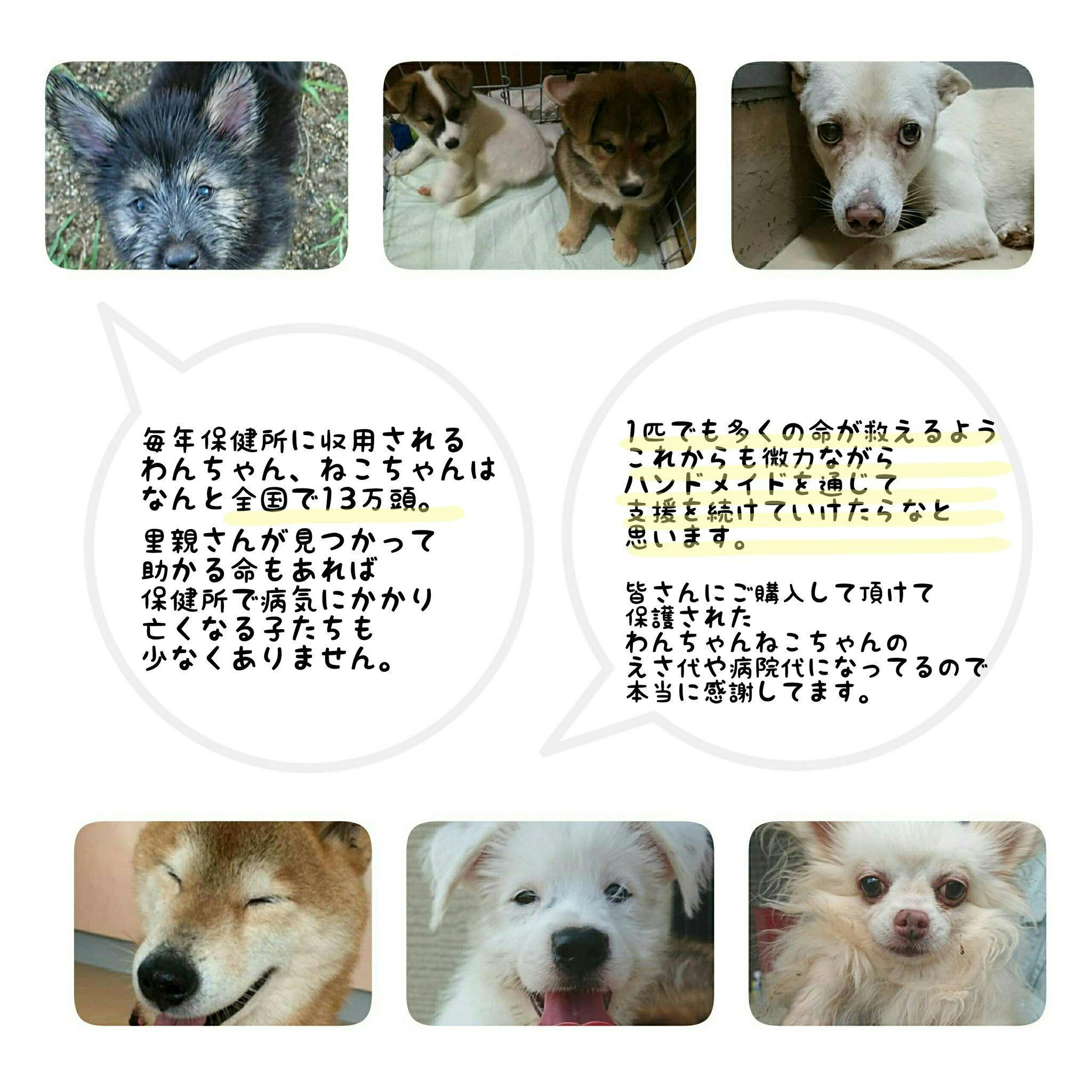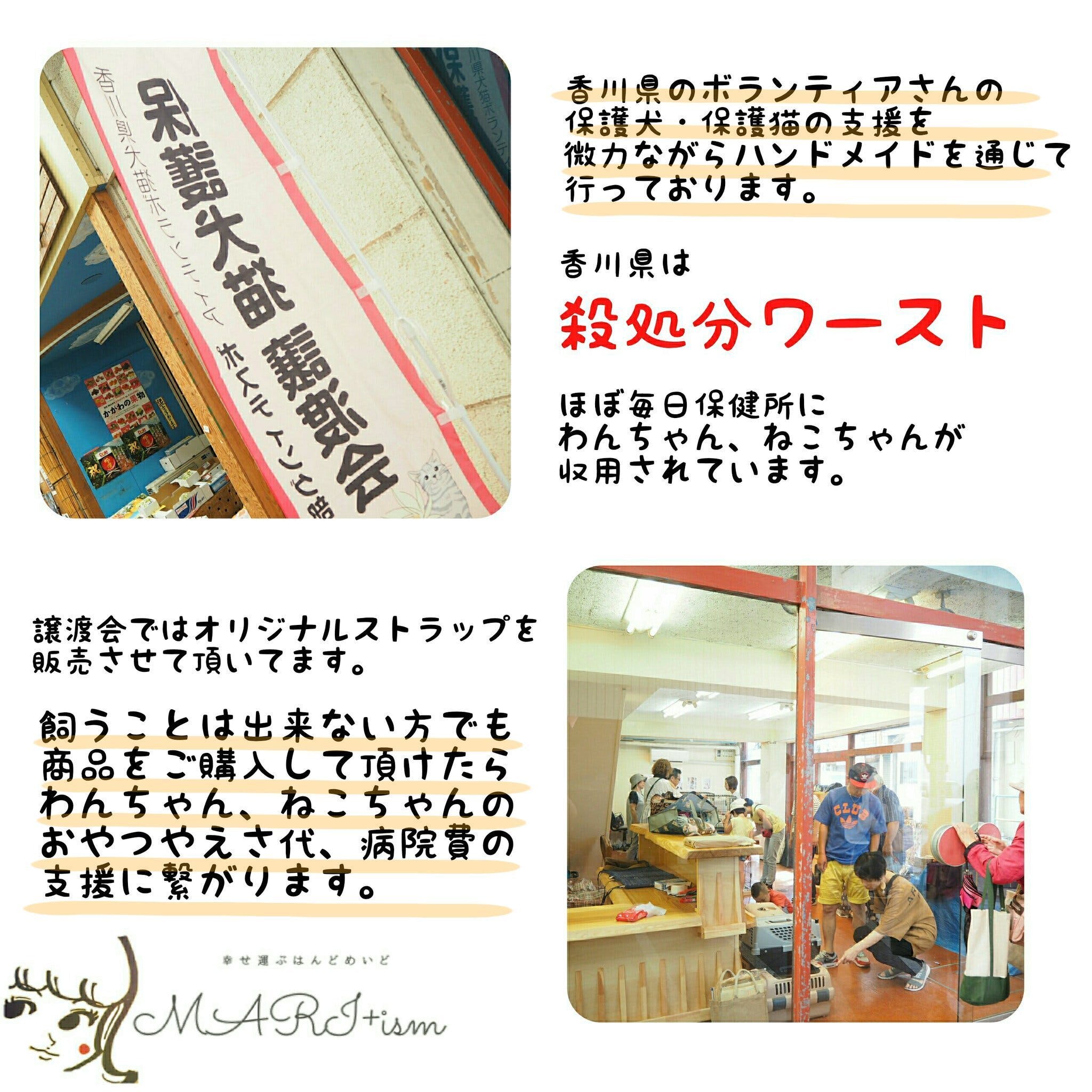 ハンドメイドの売上の一部を保護犬猫の支援に充てています。支援先香川県観音寺市で活動しているポスティング部の荻田さん、猫シェルター兼猫雑貨屋さんをしているヤマネコ手芸店さん。