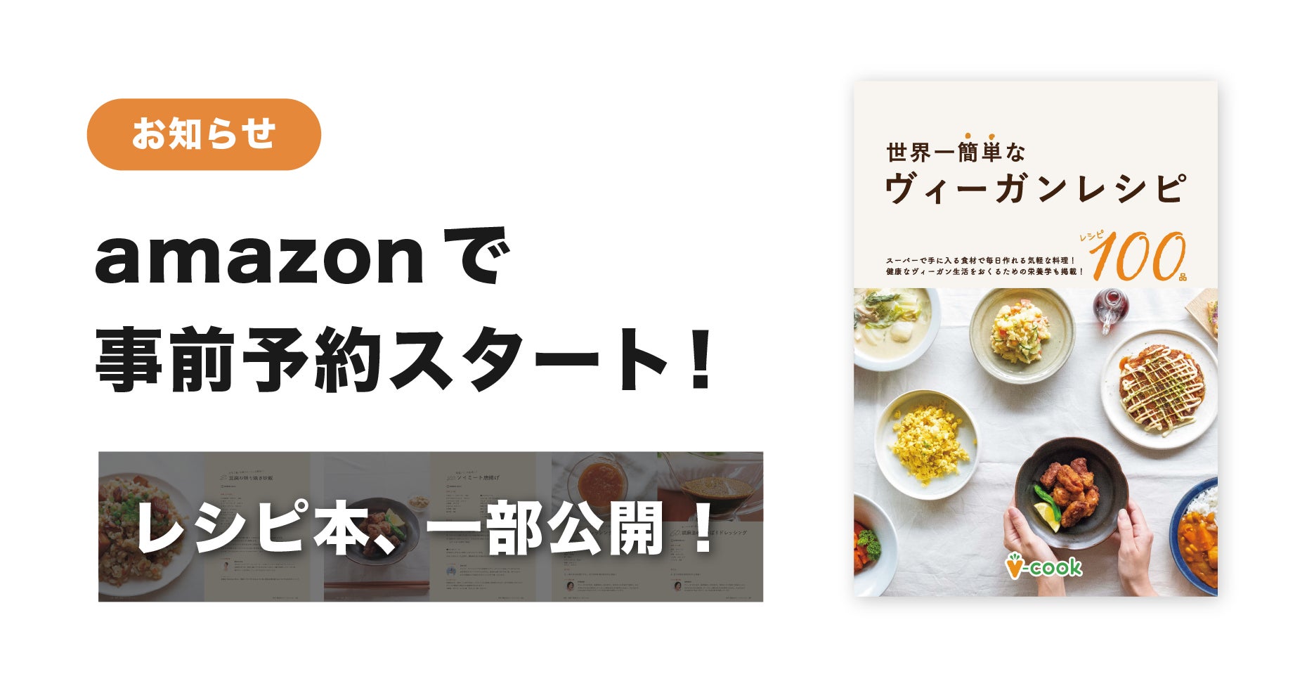 お久しぶりです!ブイクックの工藤柊です。4,5月でクラウドファンディングを実施した今回のレシピ本『世界一簡単なヴィーガンレシピ』のデザインが先月末で終了しました。最後の1日まで良いレシピ本にするためにこだわり抜いてくださったデザイナーのおざきさん、神戸新聞総合出版センターの皆様、ありがとうございました。そして!amazonにて、事前予約がスタートしました!事前予約はこちらからクラウドファンディングでご購入できなかった方から「レシピ本はどこで買えますか?」「レシピ本はいつ販売ですか?」などのメッセージをいただいていました。ご支援いただいた皆さんの周りに、ヴィーガン料理に興味がある方がいらっしゃれば紹介していただけると嬉しいです...!また、完成したレシピ本のデザインを一部をamazonでも公開しています。ここでも、レシピ本の一部を掲載しておきます!クラウドファンディングにご支援いただいた方々には、レシピ本が届き次第、すぐに配送いたします!今しばらく、お待ちください。そして、「まだ購入していないけど興味がある」という方は、ぜひamazonページをご覧いただけると嬉しいです。事前予約はこちらからまた進捗がありましたら、活動報告を投稿します!それでは!