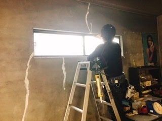 雨が降ると窓周辺のひび割れから水が染み出してくるので、その補修から〜バナナ王国建設に向けての記念すべき第一歩です(≧∇≦)キャー♪