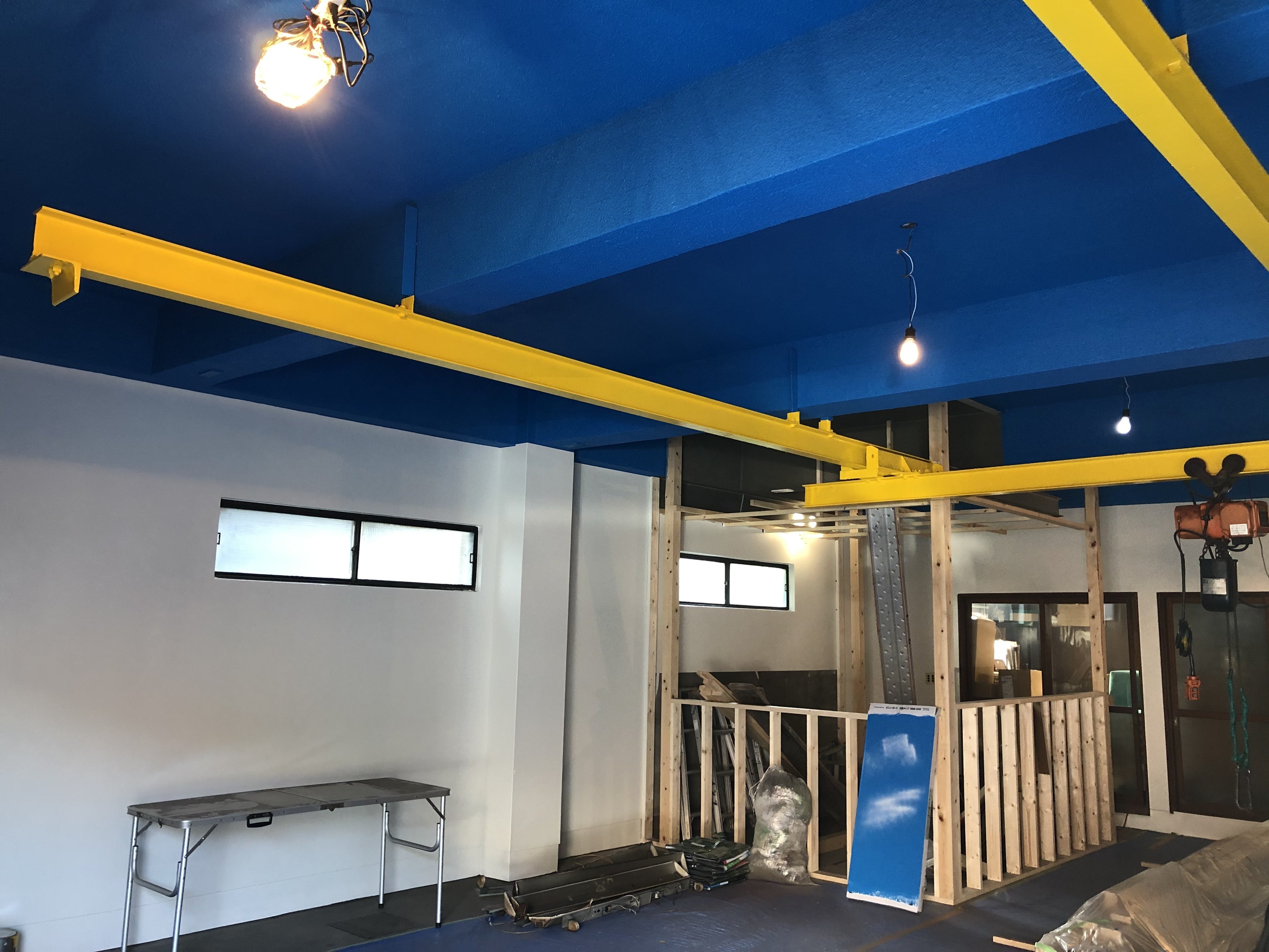壁はホワイト、南国の空をイメージした天井はブルー、ホイストのレールはバナナ色のイエロー♪♪