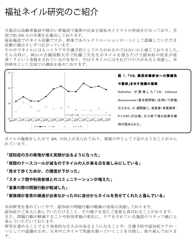 ネイルによる効果については研究が進められ上記の図のような研究結果も発表されています。介護予防や老化防止に効果があることをたくさんの方に知って頂きたいと思い、本格的に滋賀県で福祉ネイルサービスを提供するネイルサロンを立ち上げようと今回のプロジェクトを決めました。